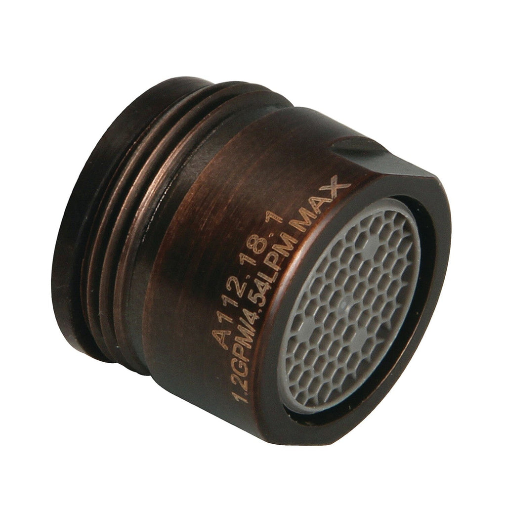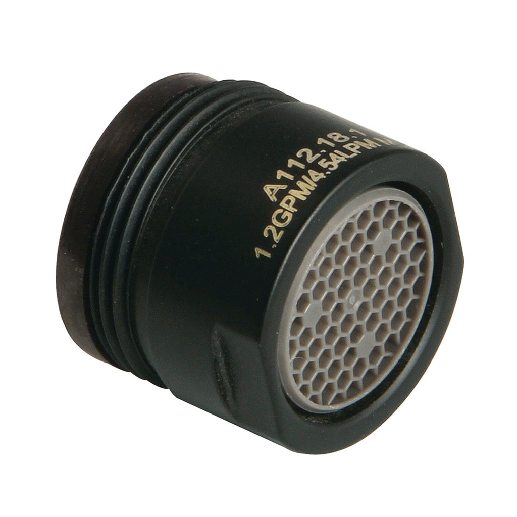 Installed at the ends of household faucets, aerators are designed with mesh screens to reduce splashing and dripping in sinks. A mixture of water and air is delivered while also helping to conserve water. This aerator's thread size: US Male M18 x 1.0 connection. The water flow rate is 1.2 gallons per minute (GPM).
