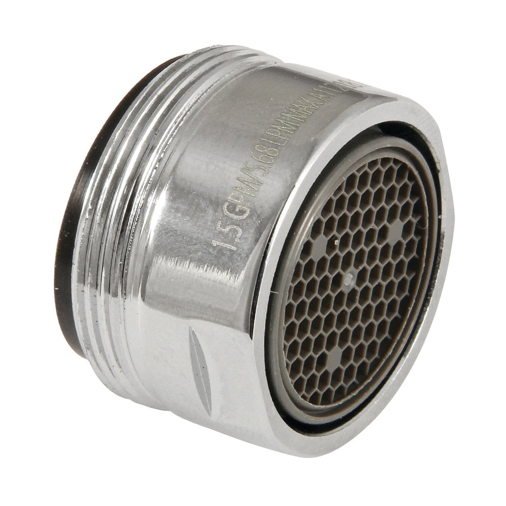 Installed at the ends of household faucets, aerators are designed with mesh screens to reduce splashing and dripping in sinks. A mixture of water and air is delivered while also helping to conserve water. This aerator's thread size: US male 15/16"-27 UNS connection. The water flow rate is 1.5 gallons per minute (GPM).