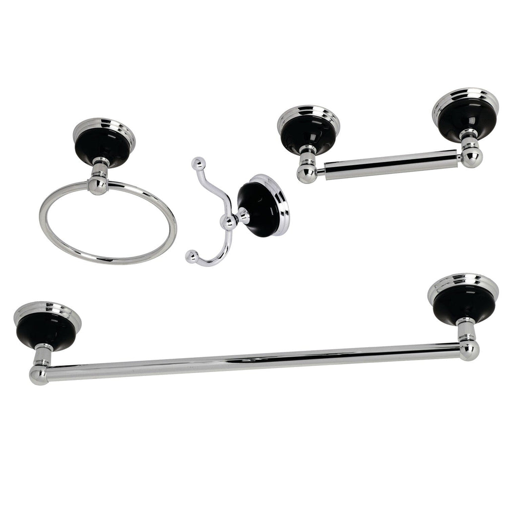 - 4-piece set includes: 18" towel bar, towel ring, robe hook, and toilet paper holder