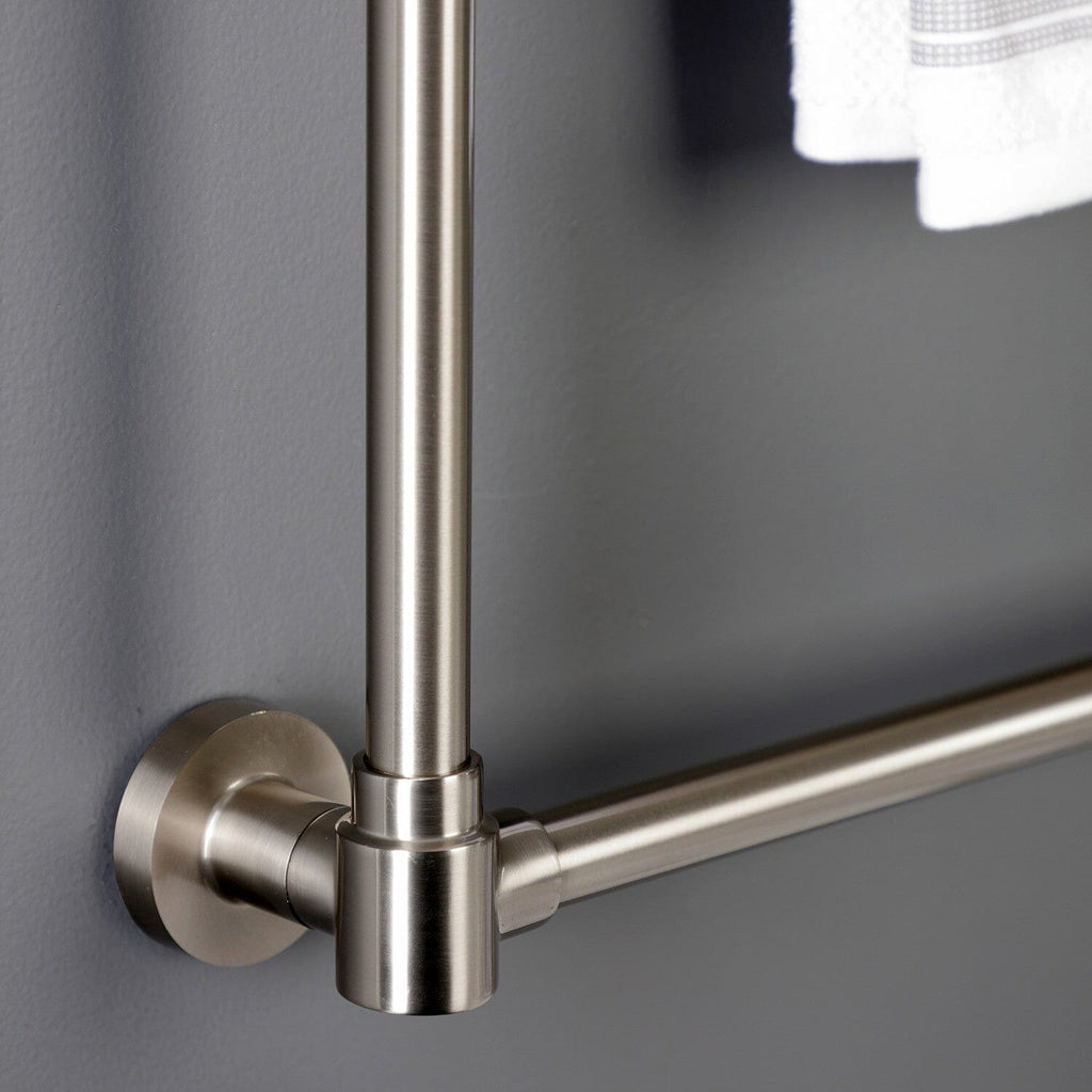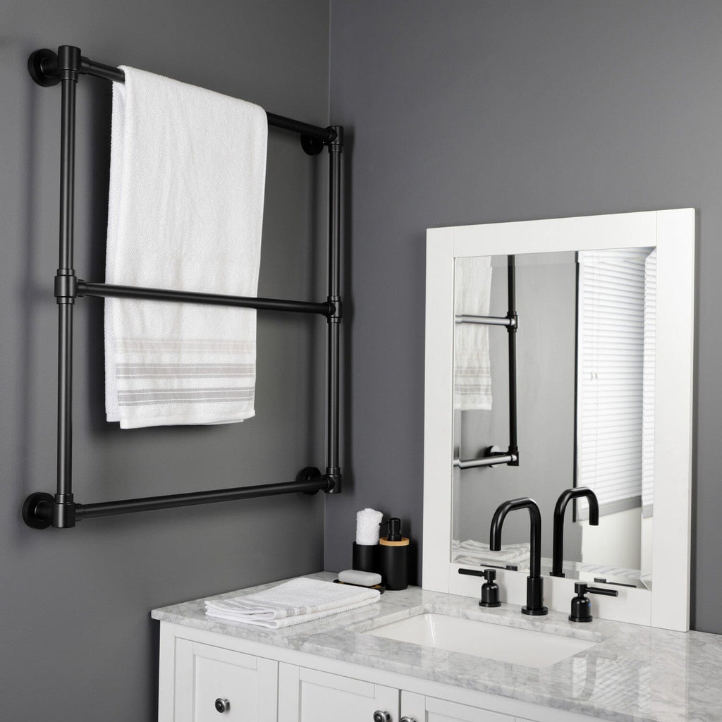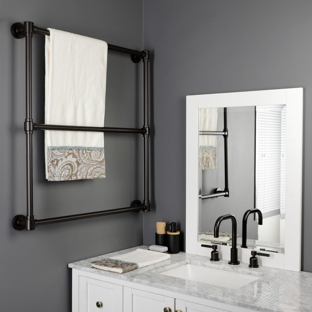 Maximize your towel hanging space with the addition of this contemporary ladder type towel rack. Its 3 horizontal levels will provide you with 90" of towel hanging space while only using 6.66 square feet of wall space. Available in many finishes to match your bathroom decor.