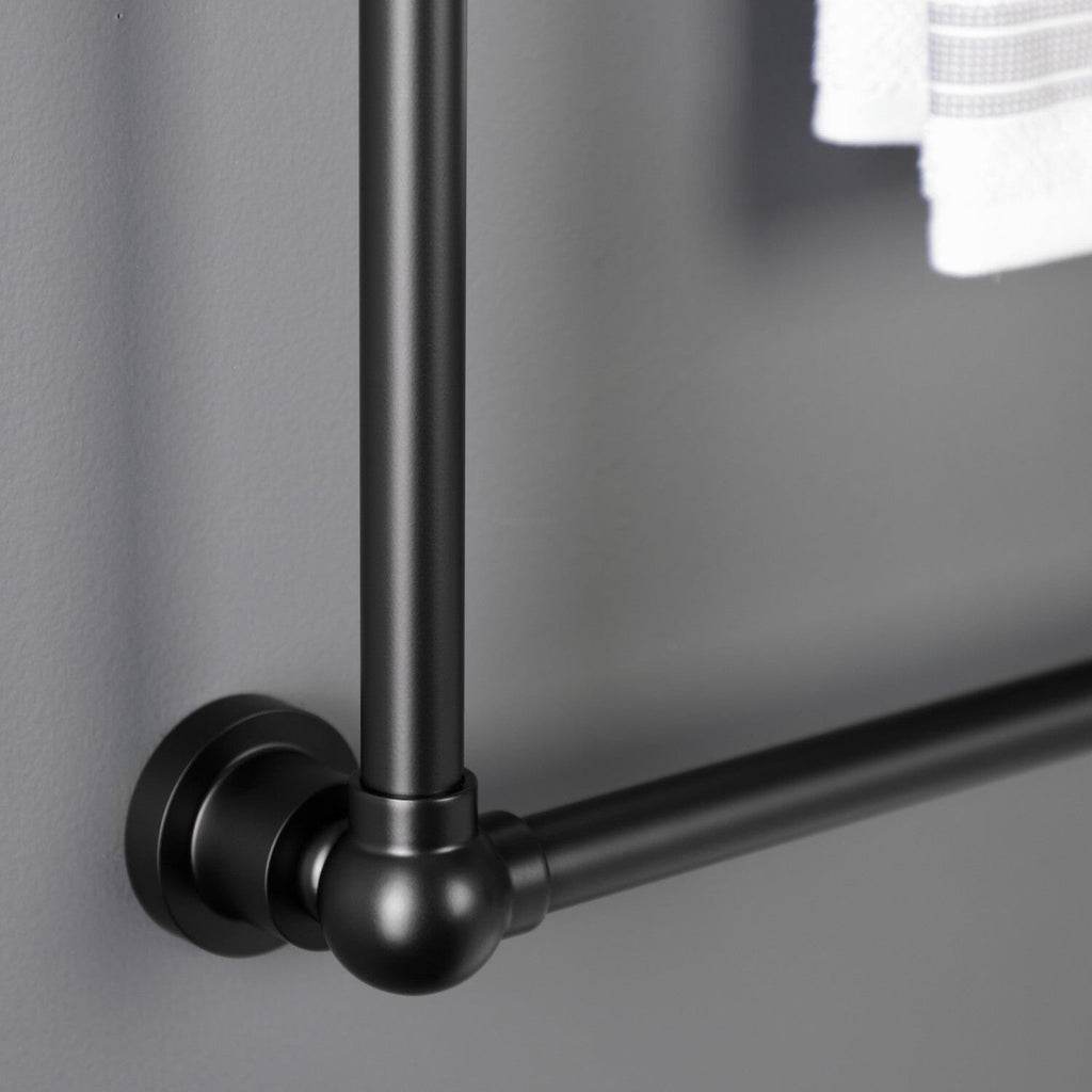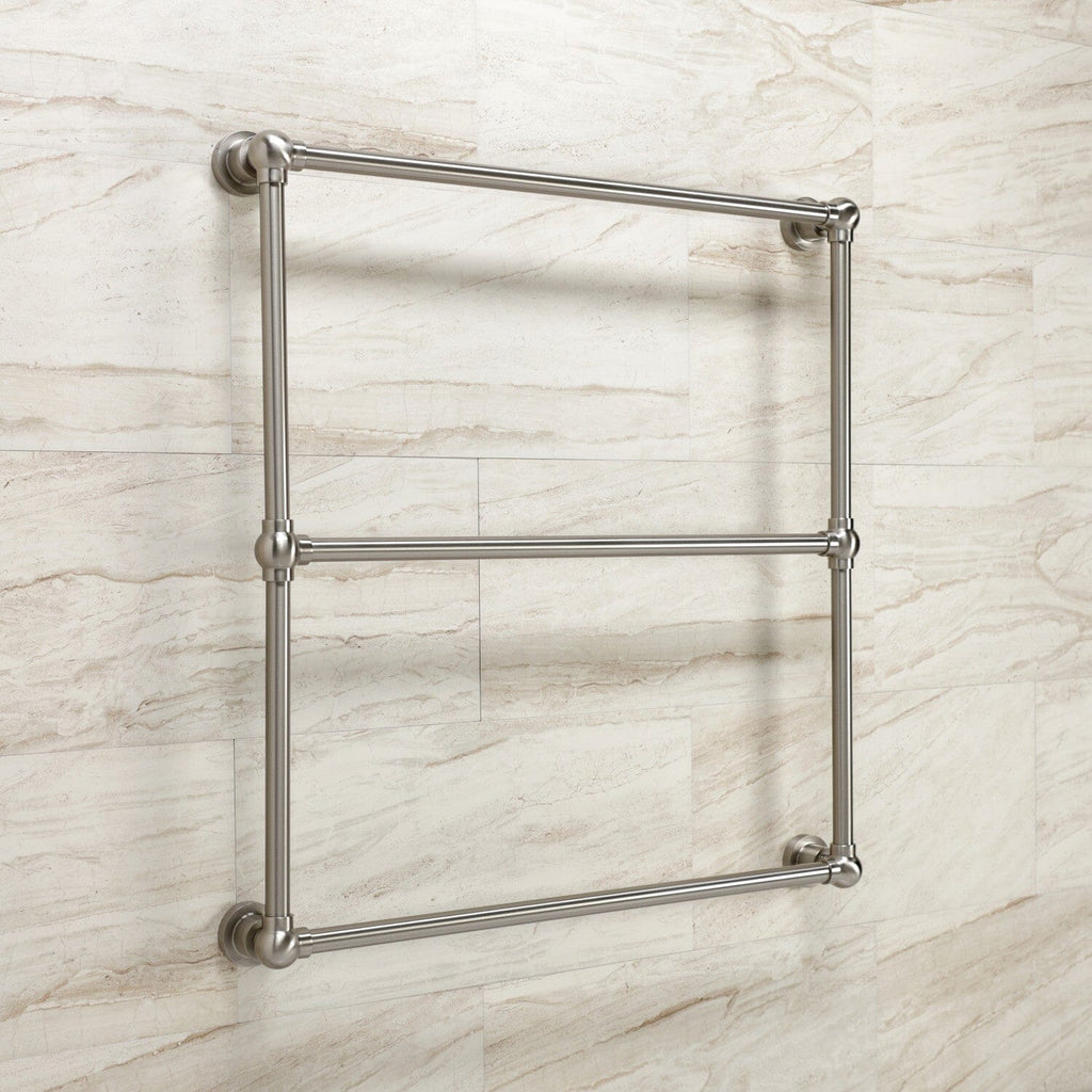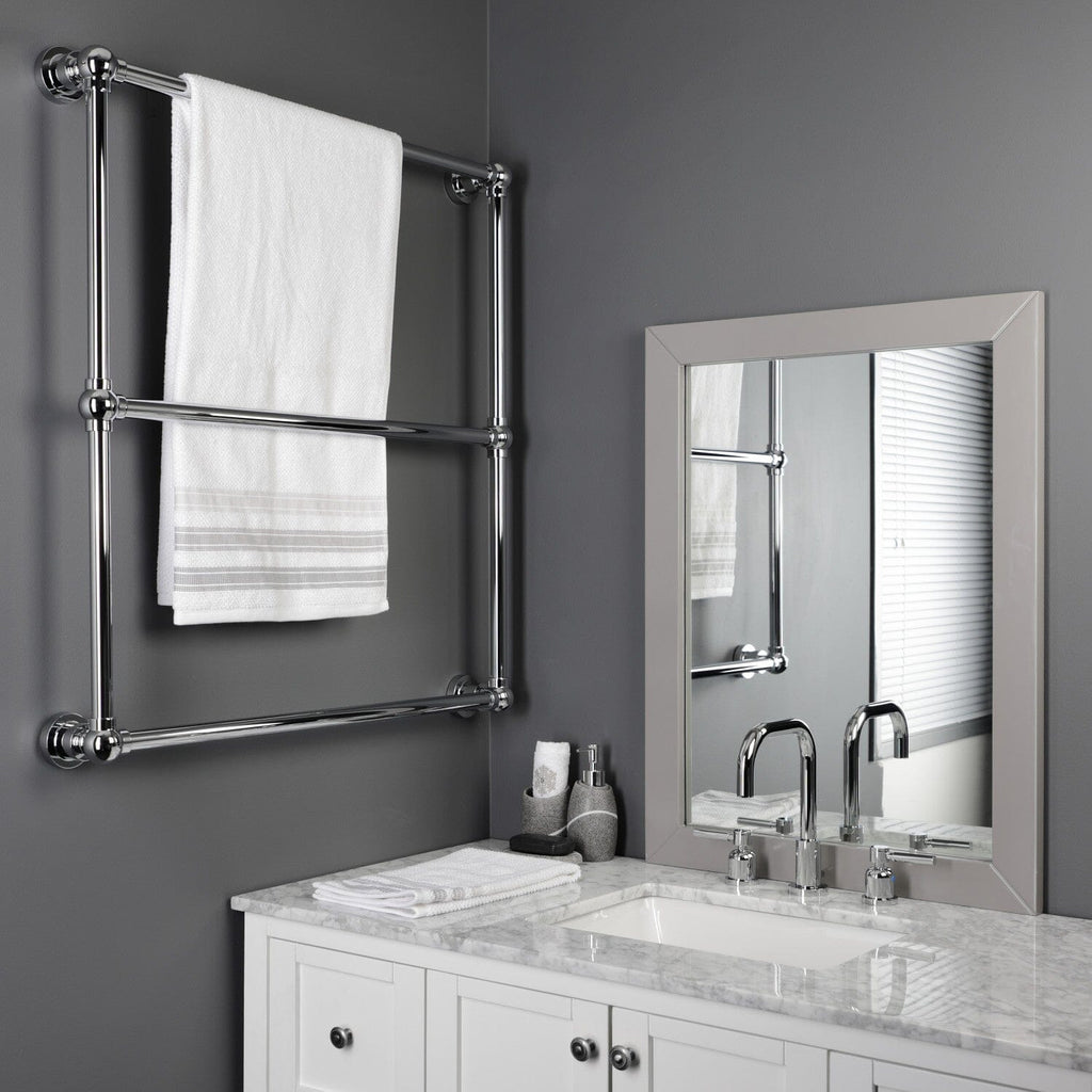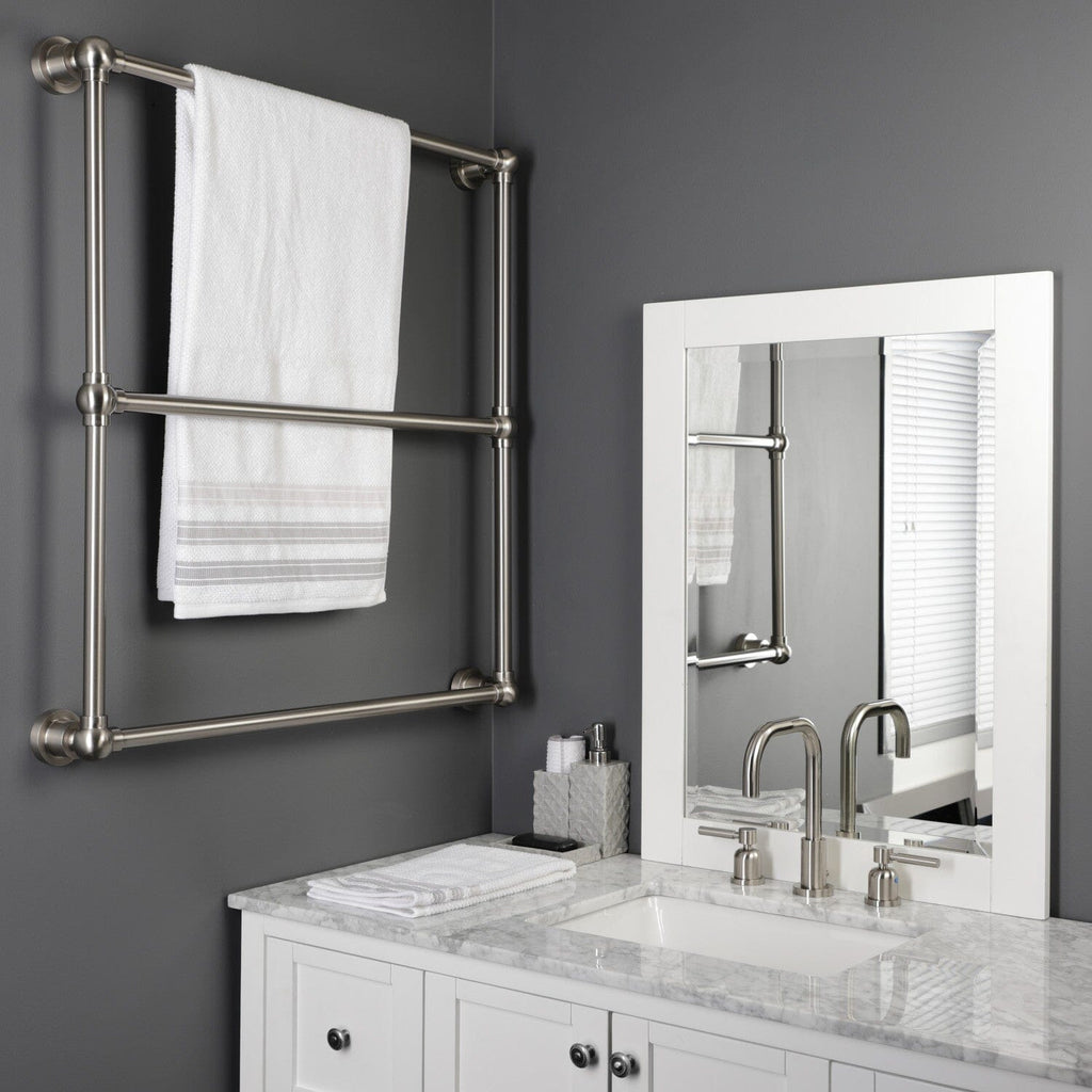 Maximize your towel hanging space with the addition of this elegant ladder type towel rack. Its 3 horizontal levels will provide you with 90" of towel hanging space while only using 6.66 square feet of wall space. Available in many finishes to match your bathroom decor.