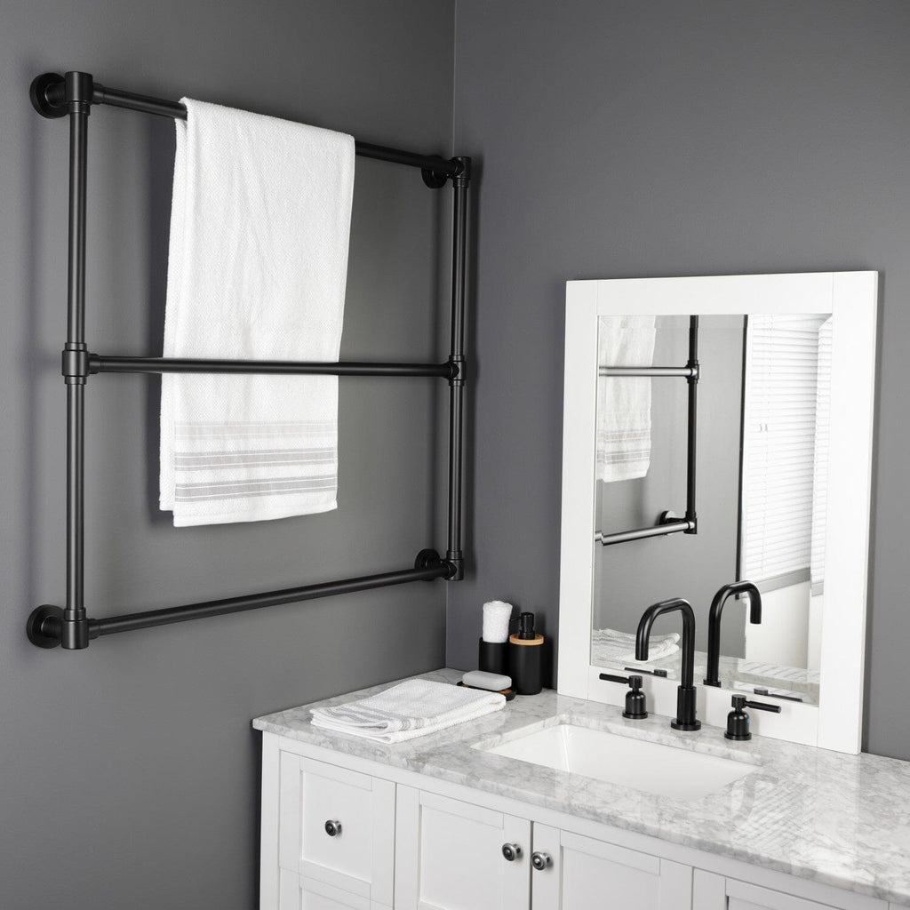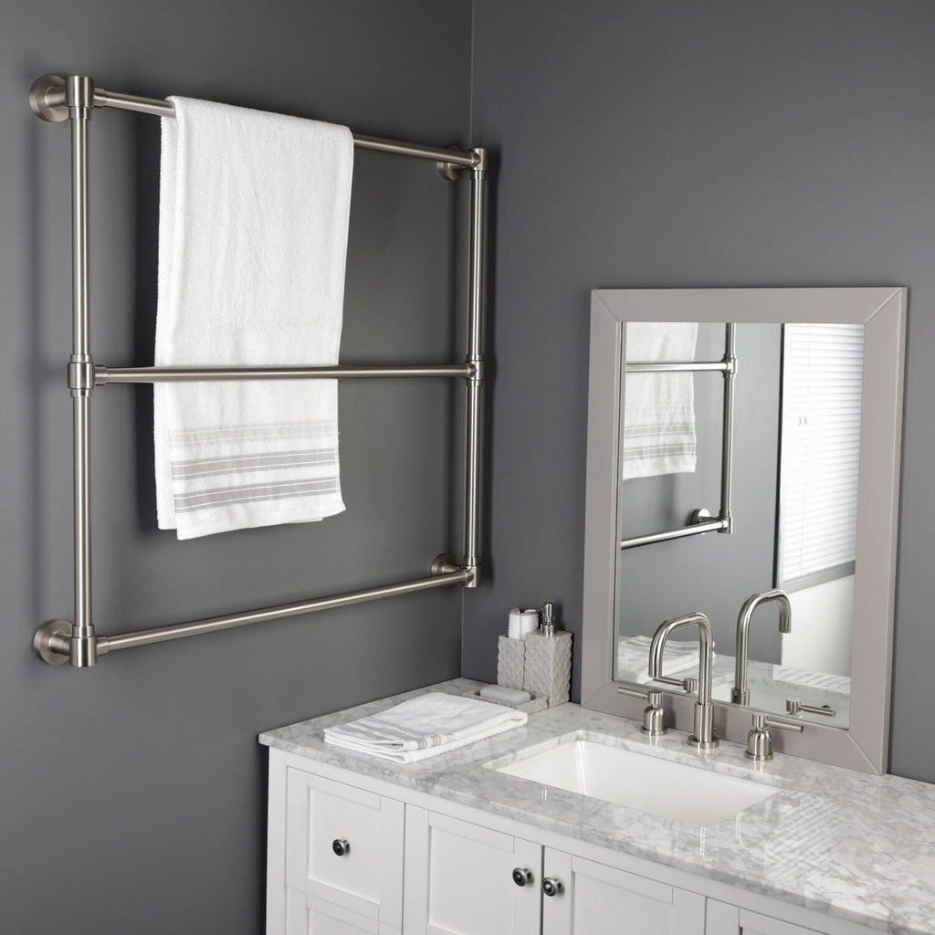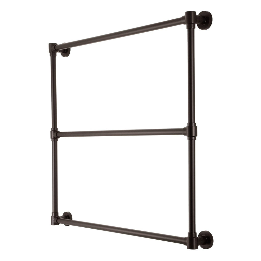 Maximize your towel hanging space with the addition of this contemporary ladder type towel rack. Its 3 horizontal levels will provide you with 108" of towel hanging space while only using 8 square feet of wall space. Available in many finishes to match your bathroom decor.