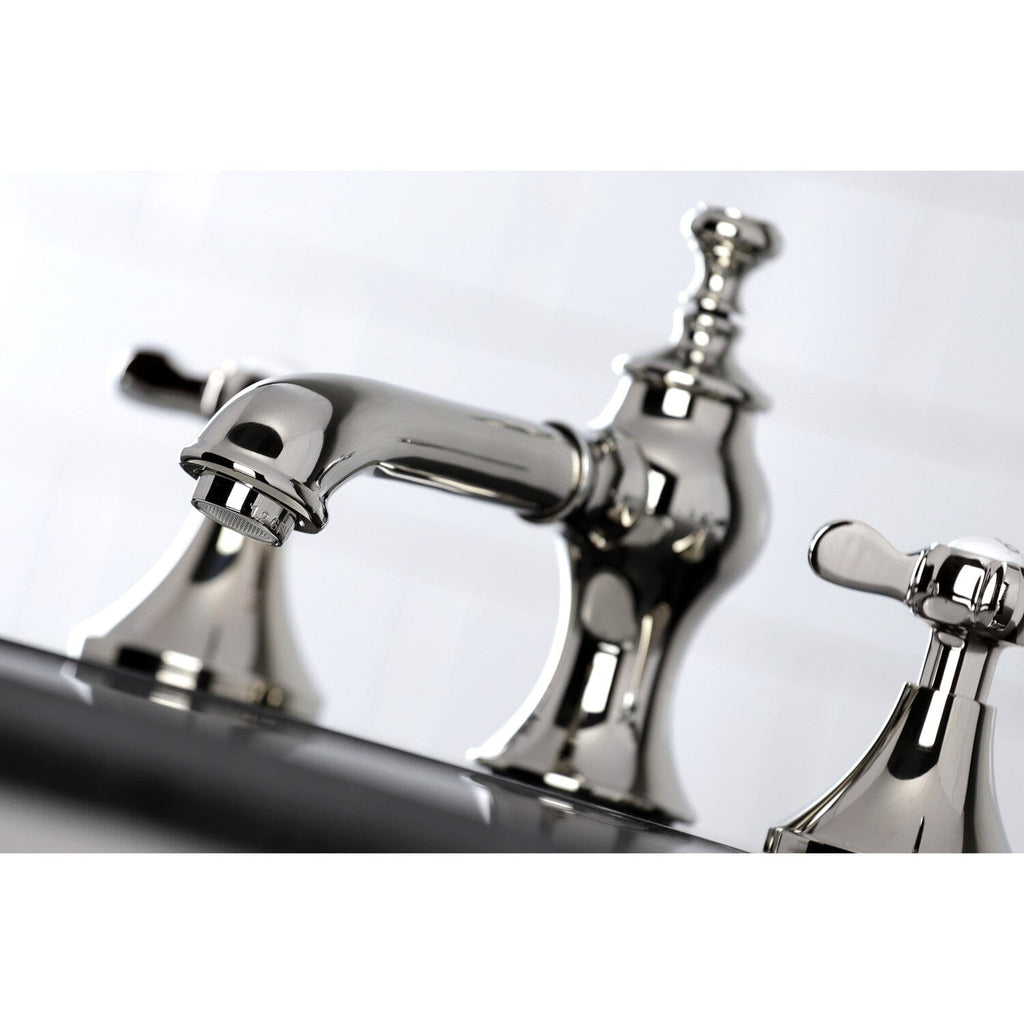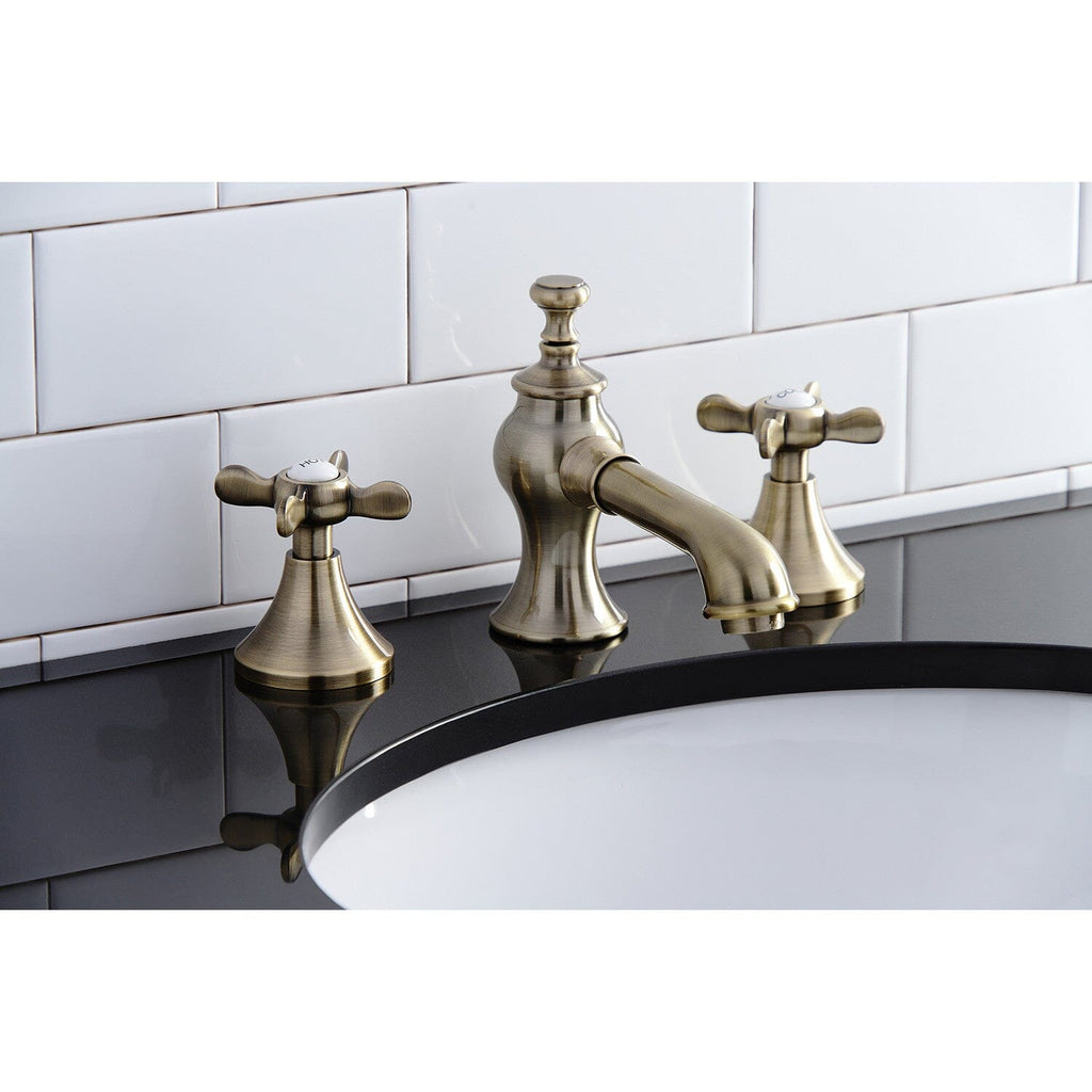 Heirloom Two-Handle 3-Hole Deck Mount Widespread Bathroom Faucet with Brass Pop-Up Ideal for more spacious bathrooms, widespread faucets are more spread apart and feature a 3-hole installation. The Heirloom 8" Widespread Bathroom Faucet, with its its featured sturdy brass construction...