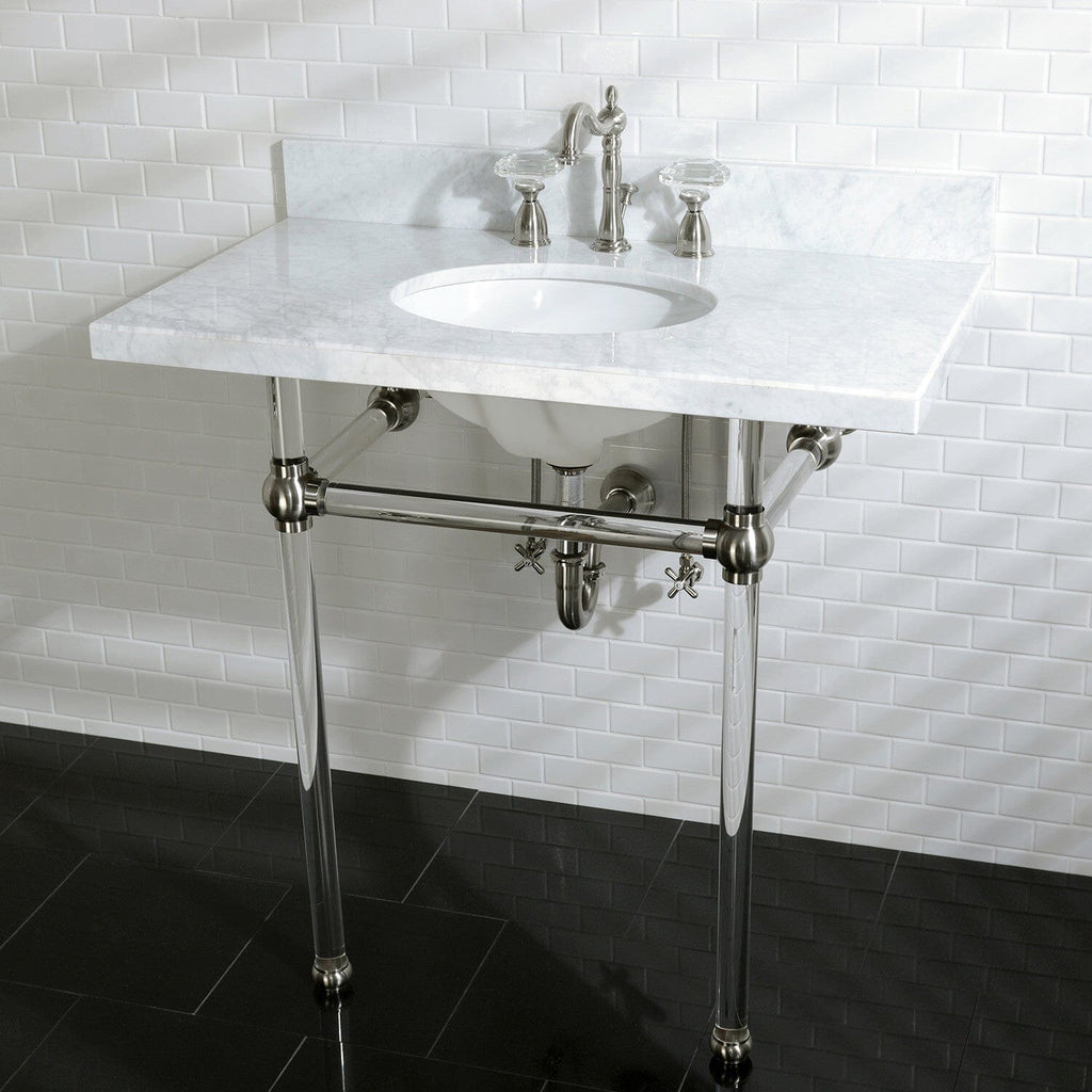 With a beautiful Carrara Marble counter top, this console sink set is a long lasting, durable, and elegant addition to your bathroom. A fabulous alternative where space is limited or tight, making them friendly for the whole family. With different shades and natural designs, otherwise known as veining, no two sinks will be alike. Also for your convenience, anti-slip rubber pads are included with the acrylic legs to ensure steadiness. Water supply kit, drain assembly, and the faucet are sold separately. Kingston's Carrara Marble tops are polished, but they are not sealed. Polished marble has a shiny surface and resists stains. Natural stone, even when polished, is still somewhat porous and does remain susceptible to etching by acidic compounds like fruit juice, vinegar, some cleaning solvents, etc. For customers that wish to further protect their investment the marble can be sealed. The following is intended solely for informational purposes. Kingston does not warranty nor accept liability for damages or other negative outcomes resulting from any treatment or coating applied to the countertop after purchase, whether applied by the customer or by a third party. For anyone unfamiliar with this nature of project, Kingston recommends consulting an experienced professional in your area. When looking for a sealant product, please be sure to seek a product specifically designed for use on polished marble, granite or other natural stone surfaces. Be sure to always avoid anything containing a citrus ingredient, acid ingredient, tung oil, linseed oil, or other natural oils. These can damage or discolor your marble.