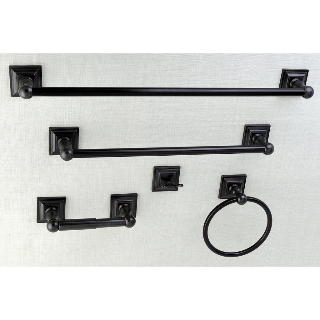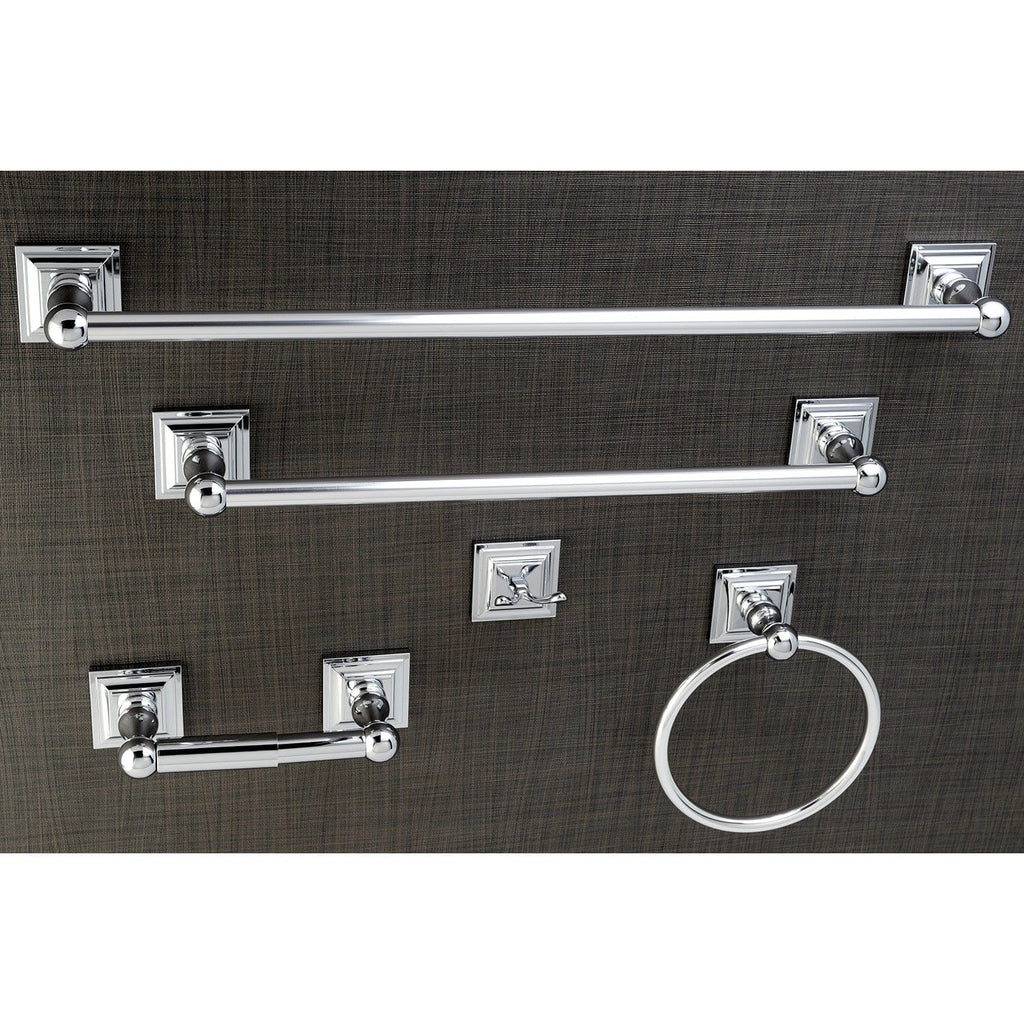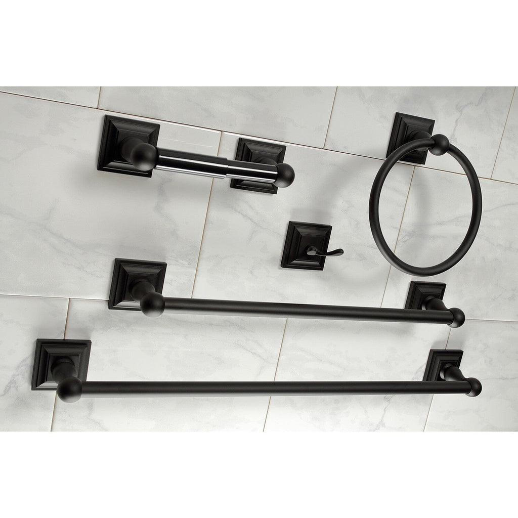 - 5-piece set includes: 18" towel bar, 24" towel bar, towel ring, robe hook, and toilet paper holder