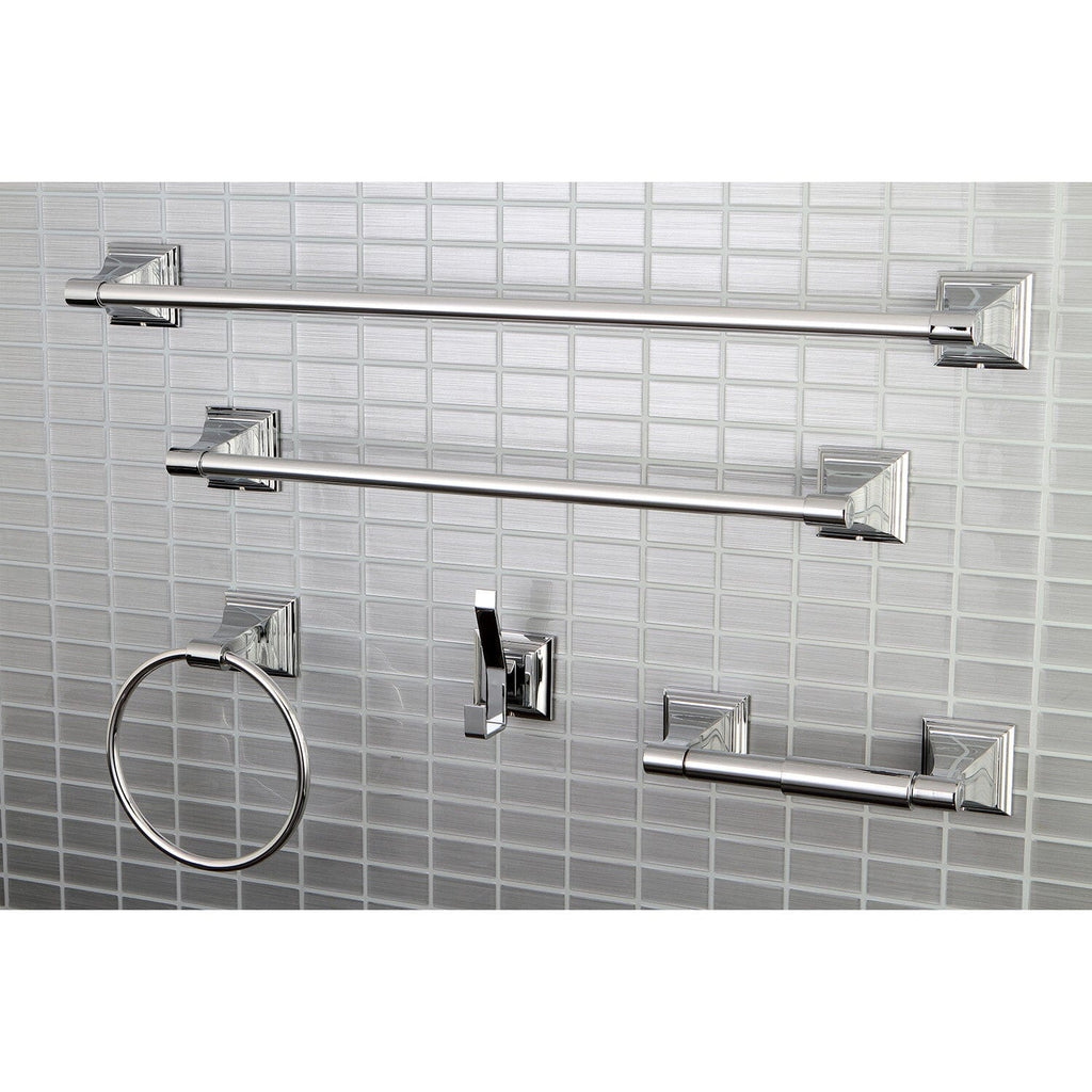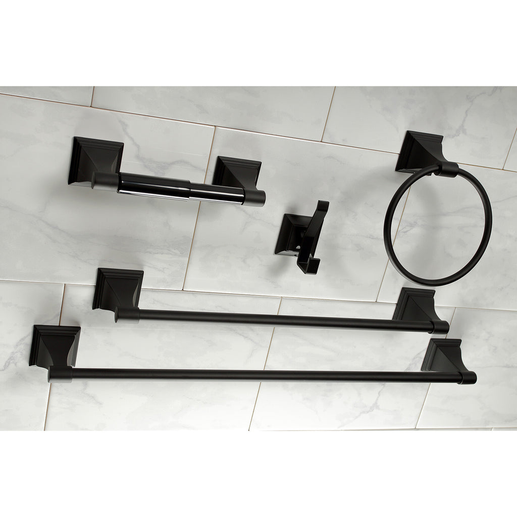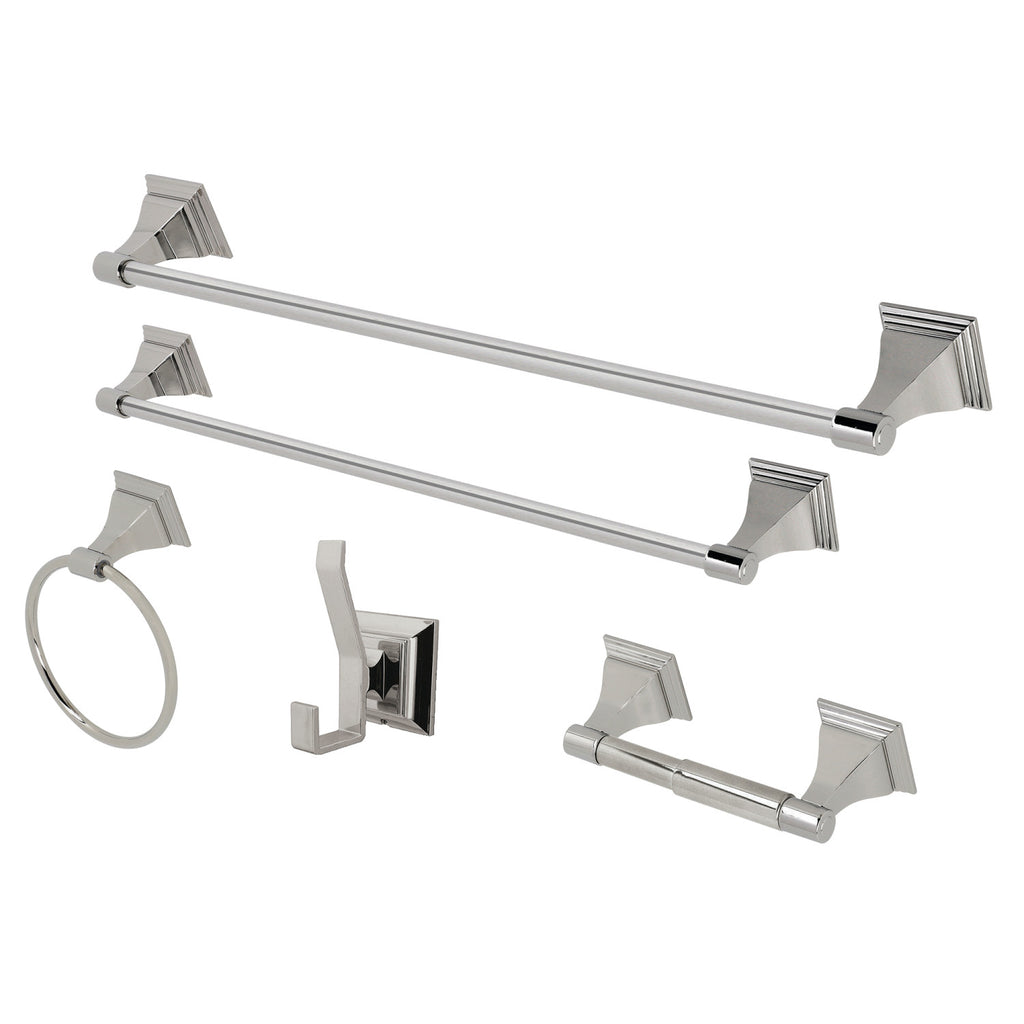 - 5-piece set includes: 18" towel bar, 24" towel bar, towel ring, robe hook, and toilet paper holder