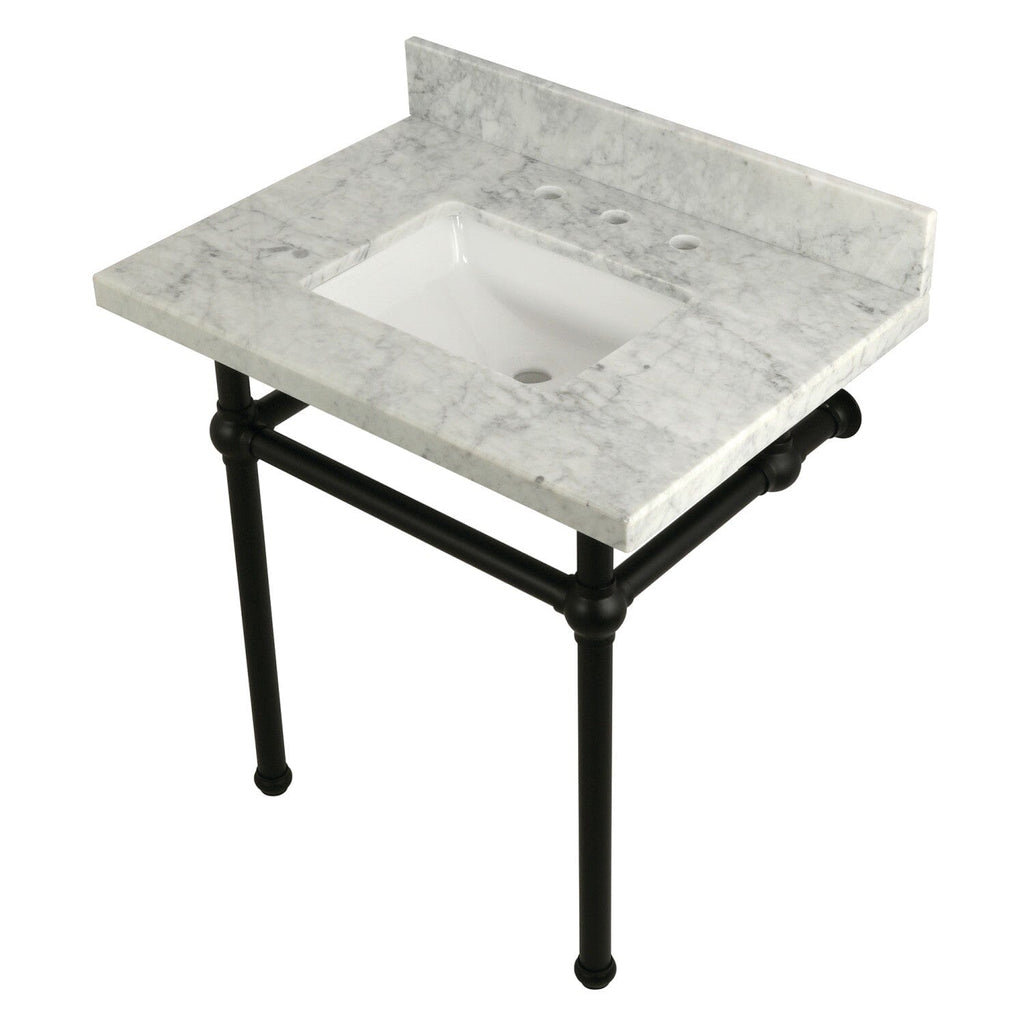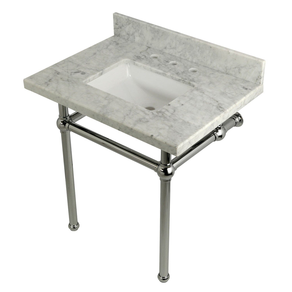 With a beautiful Carrara Marble counter top, this console sink set is a long lasting, durable, and elegant addition to your bathroom. A fabulous alternative where space is limited or tight, making them friendly for the whole family. With different shades and natural designs, otherwise known as veining, no two sinks will be alike. Also for your convenience, anti-slip rubber pads are included with the brass legs to ensure steadiness. Water supply kit, drain assembly, and the faucet are sold separately. Kingston's Carrara Marble tops are polished, but they are not sealed. Polished marble has a shiny surface and resists stains. Natural stone, even when polished, is still somewhat porous and does remain susceptible to etching by acidic compounds like fruit juice, vinegar, some cleaning solvents, etc. For customers that wish to further protect their investment the marble can be sealed. The following is intended solely for informational purposes. Kingston does not warranty nor accept liability for damages or other negative outcomes resulting from any treatment or coating applied to the countertop after purchase, whether applied by the customer or by a third party. For anyone unfamiliar with this nature of project, Kingston recommends consulting an experienced professional in your area. When looking for a sealant product, please be sure to seek a product specifically designed for use on polished marble, granite or other natural stone surfaces. Be sure to always avoid anything containing a citrus ingredient, acid ingredient, tung oil, linseed oil, or other natural oils. These can damage or discolor your marble.
