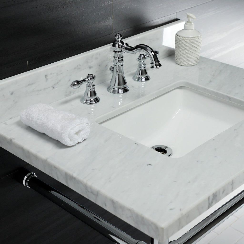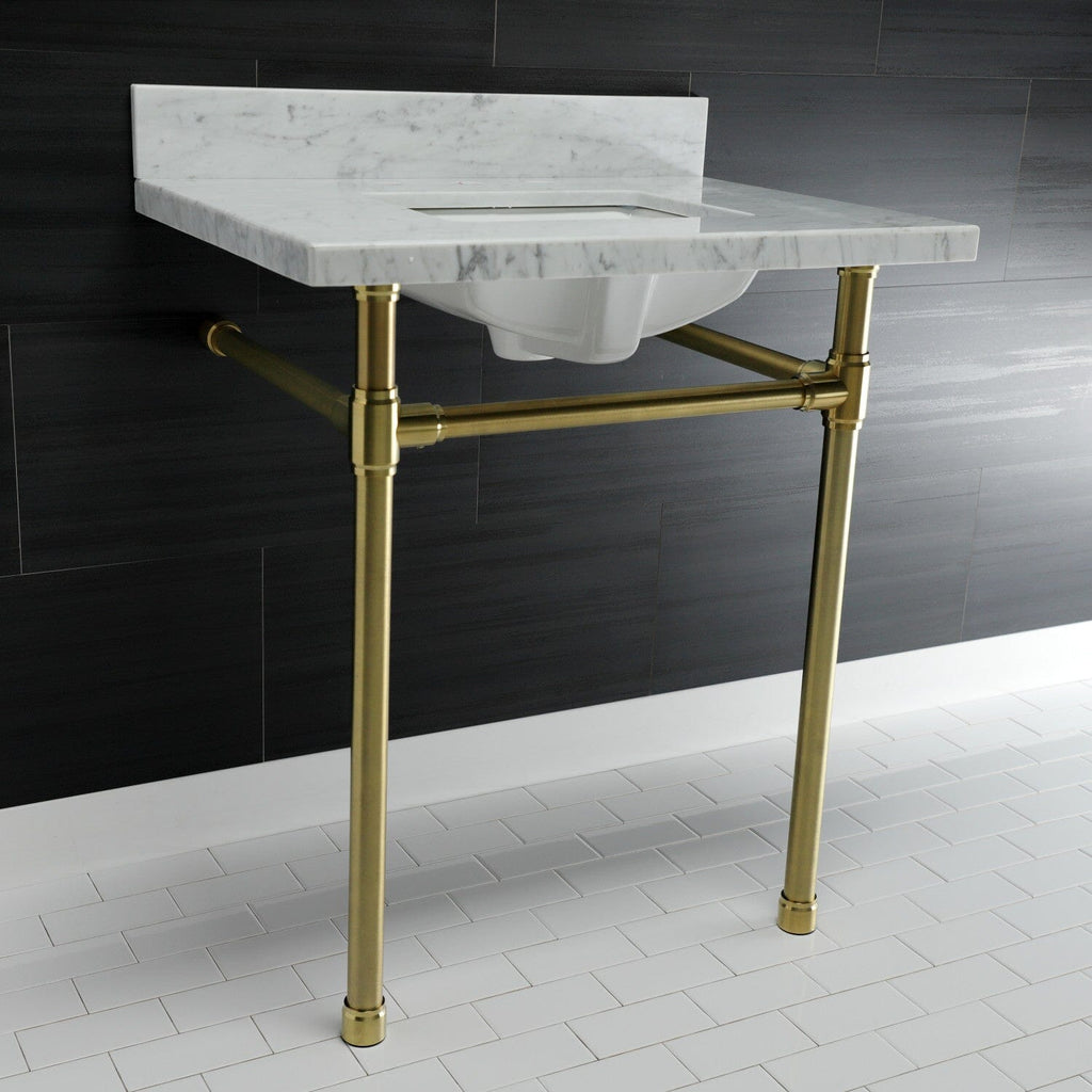 With a beautiful Carrara Marble counter top, this console sink set is a long lasting, durable, and elegant addition to your bathroom. A fabulous alternative where space is limited or tight, making them friendly for the whole family. With different shades and natural designs, otherwise known as veining, no two sinks will be alike. Also for your convenience, anti-slip rubber pads are included with the stainless steel legs to ensure steadiness. Water supply kit, drain assembly, and the faucet are sold separately. Kingston's Carrara Marble tops are polished, but they are not sealed. Polished marble has a shiny surface and resists stains. Natural stone, even when polished, is still somewhat porous and does remain susceptible to etching by acidic compounds like fruit juice, vinegar, some cleaning solvents, etc. For customers that wish to further protect their investment the marble can be sealed. The following is intended solely for informational purposes. Kingston does not warranty nor accept liability for damages or other negative outcomes resulting from any treatment or coating applied to the countertop after purchase, whether applied by the customer or by a third party. For anyone unfamiliar with this nature of project, Kingston recommends consulting an experienced professional in your area. When looking for a sealant product, please be sure to seek a product specifically designed for use on polished marble, granite or other natural stone surfaces. Be sure to always avoid anything containing a citrus ingredient, acid ingredient, tung oil, linseed oil, or other natural oils. These can damage or discolor your marble.