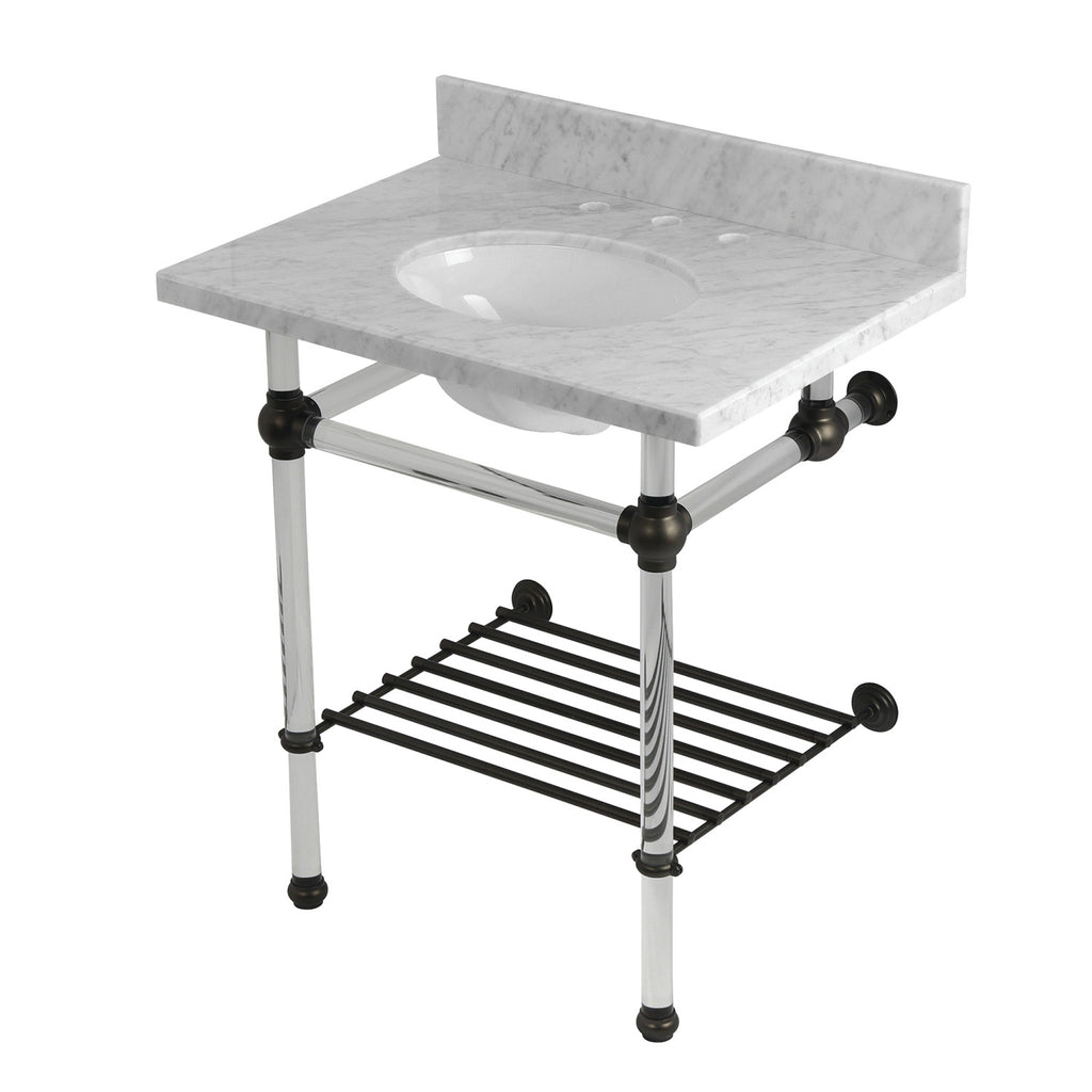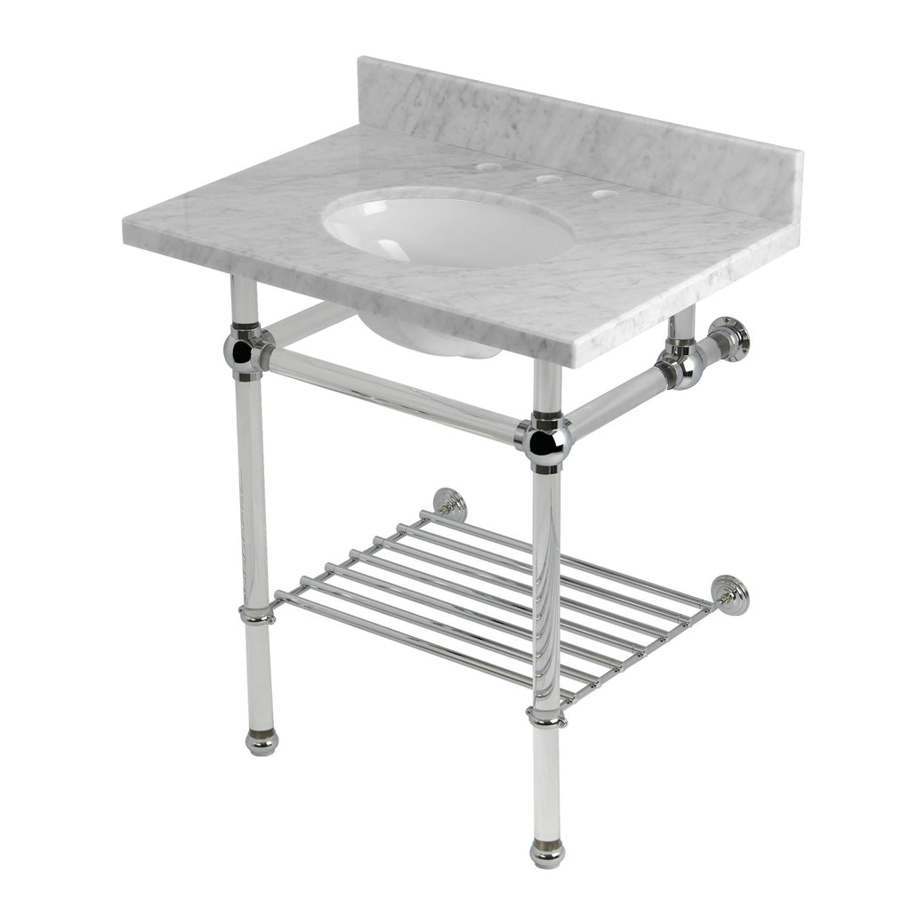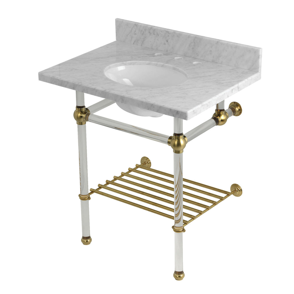 Templeton 30-Inch Carrara Marble Console Sink with Acrylic Legs and Shelf (8-Inch, 3-Hole)