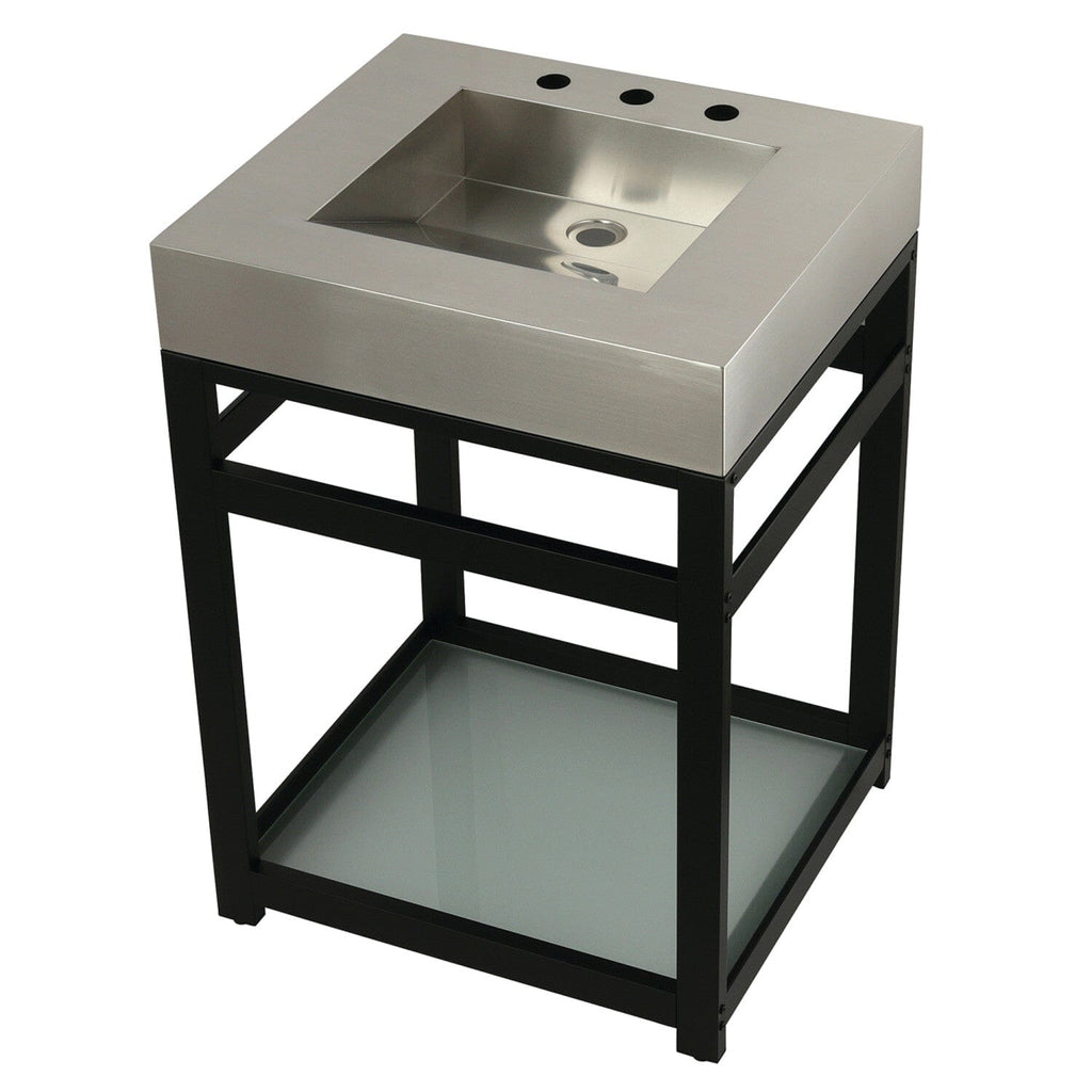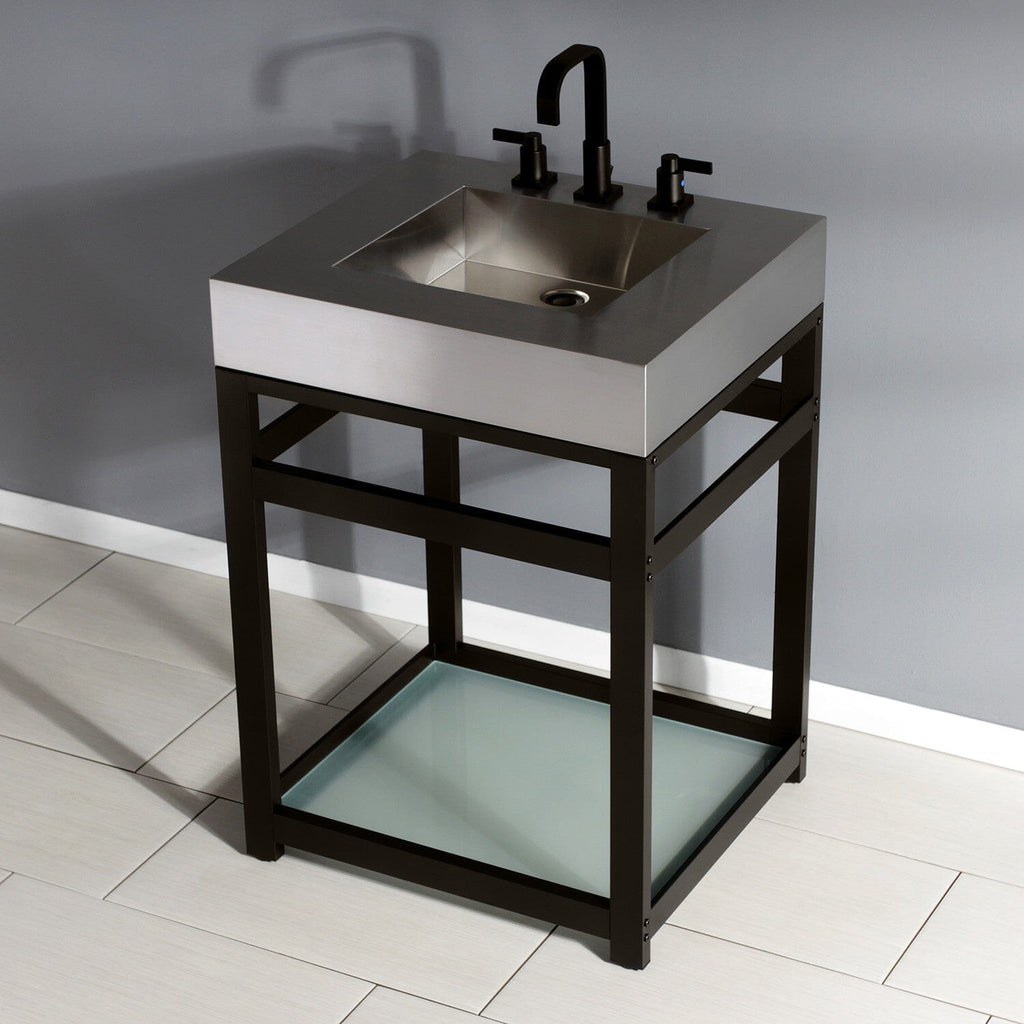 The Kingston Commercial collection brings forth bold design and smooth lines, enhancing your contemporarily styled home. Heavy, durable, and beautiful, this bathroom sink top will give your bathroom a sleek, modern design. Constructed out of stainless steel, this sink top is built for long-lasting durability while offering contemporary stylings. The Kingston Commercial 25" stainless steel console vanity sink features a wash basin and steel base that can be accented with a handful of finish options. With a rust-resistant brushed finish, stainless steel is also resistant to scratches for a long-lasting, durable product. Additionally, this vanity base comes with a tempered glass shelf for added functionality and aesthetic appeal. These console vanities will stylishly and effortlessly become a part of your home, completing your modern bathroom ensemble.