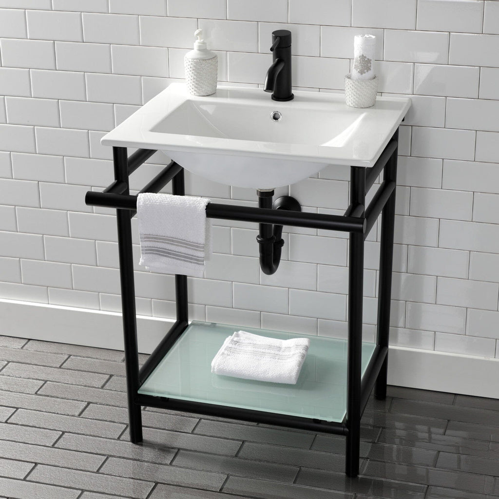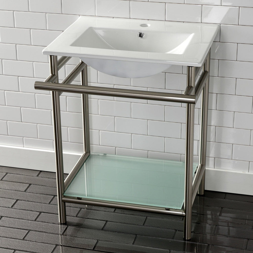 Sheridan 24-Inch Ceramic Console Sink with Stainless Steel Legs and Glass Shelf (1-Hole)