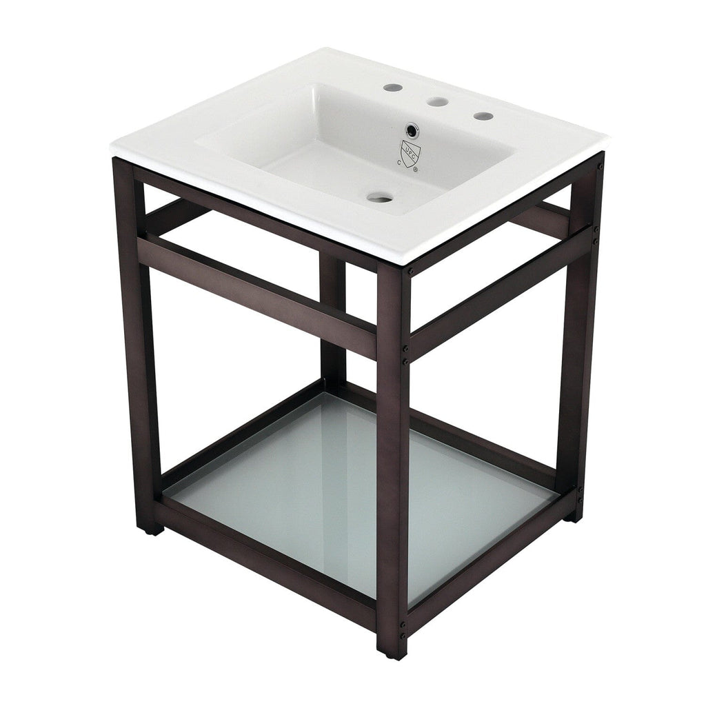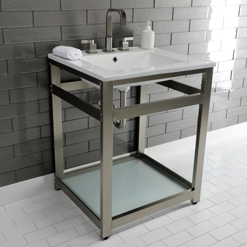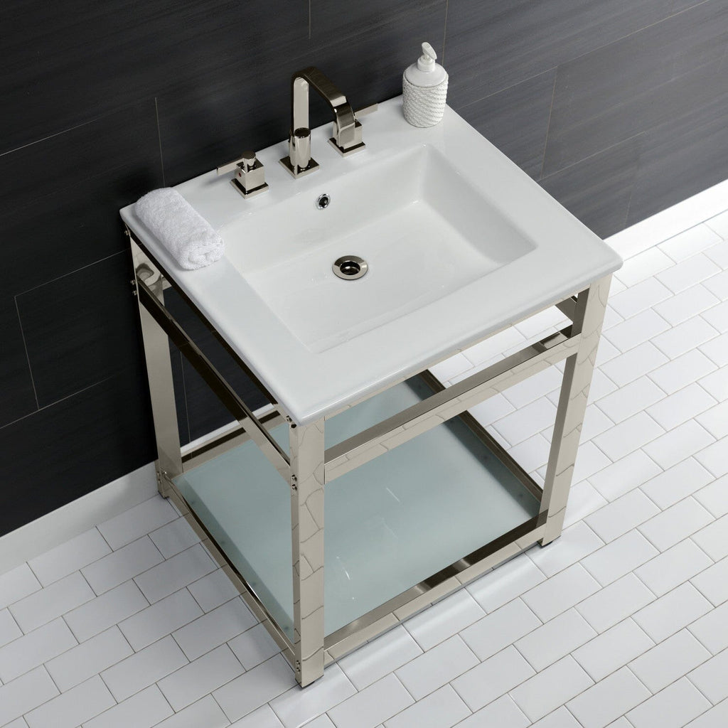 Quadras 25-Inch Ceramic Console Sink with Steel Base and Glass Shelf (8-Inch, 3-Hole)