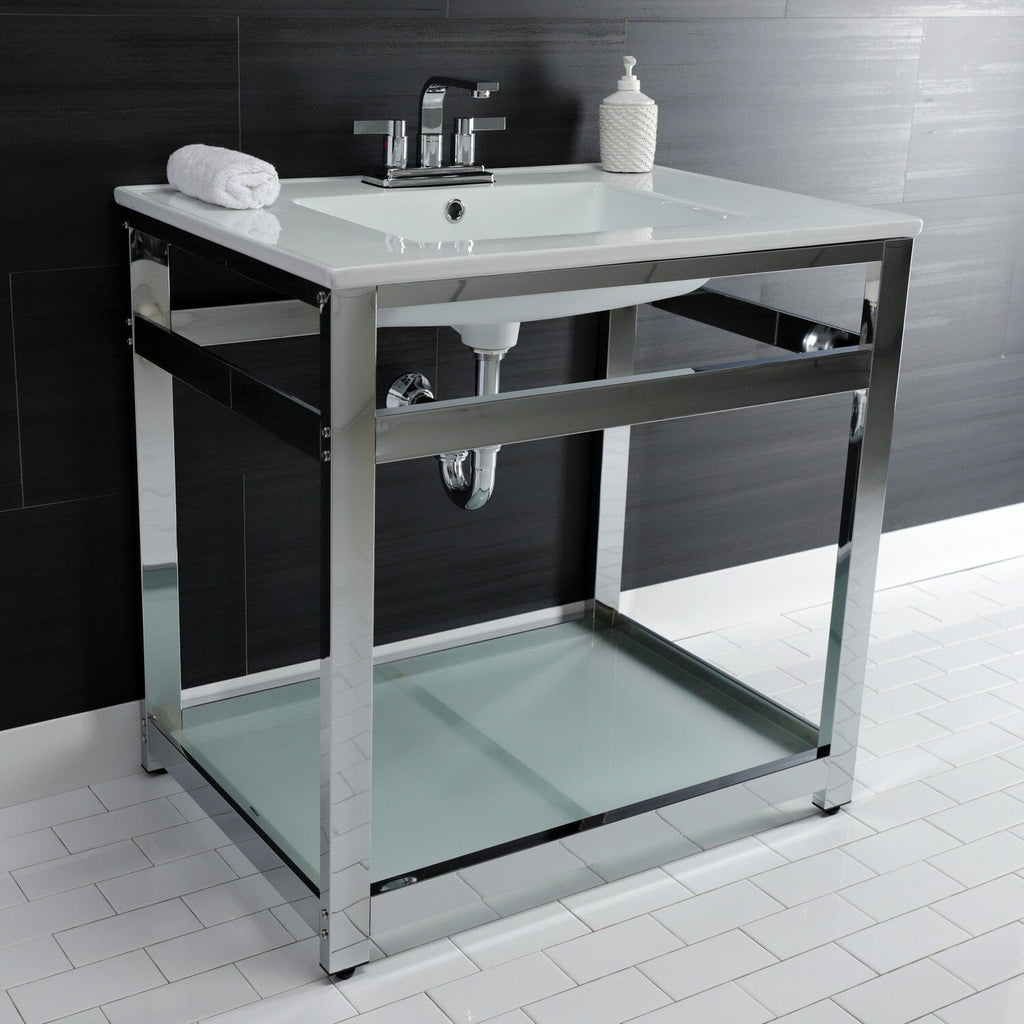 Quadras 31-Inch Ceramic Console Sink with Steel Base and Glass Shelf (4-Inch, 3-Hole)