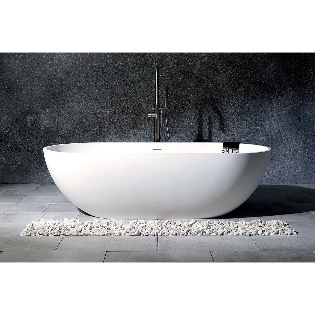 Elevate your home's contemporary decorum, while you effortlessly recline in the cozy embrace of a Designer Hardware freestanding bathtub. Highly acclaimed for its clean and contemporary yet minimalist shape, this tub will be made the focal point in many bathrooms. The Aqua Eden 70-Inch Solid Surface White Stone Freestanding Oval Tub with Drain will wholly beautify your home for years to come thanks to its durable and scratch resistant solid surface construction. This bathtub is finished inside and out in an elegant, high-design inspired matte white that brings subtle but unmistakable sophistication to the bathing experience.