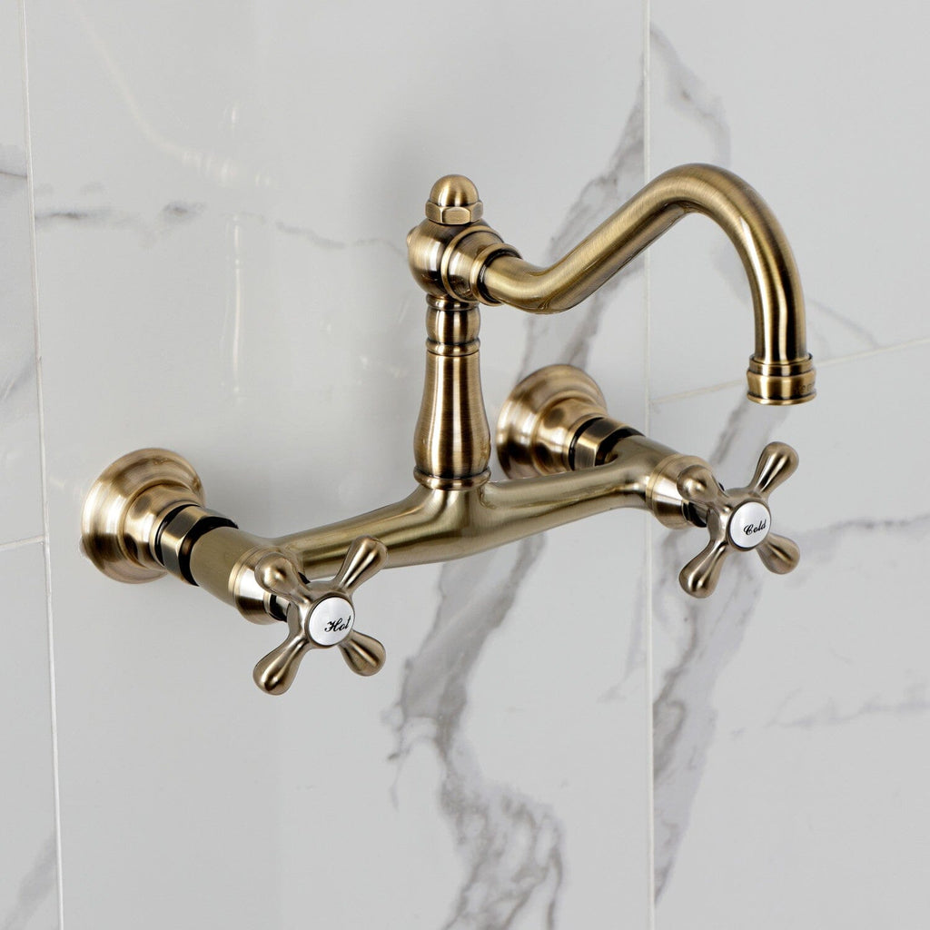 Vintage Double-Handle 3-Hole Wall Mount Bathroom Faucet Return to the antique designs of the early 20th Century with this faucet, offering detailings of refined splendor and ornate design to your home. Attached to the wall behind your sink, the horizontal...