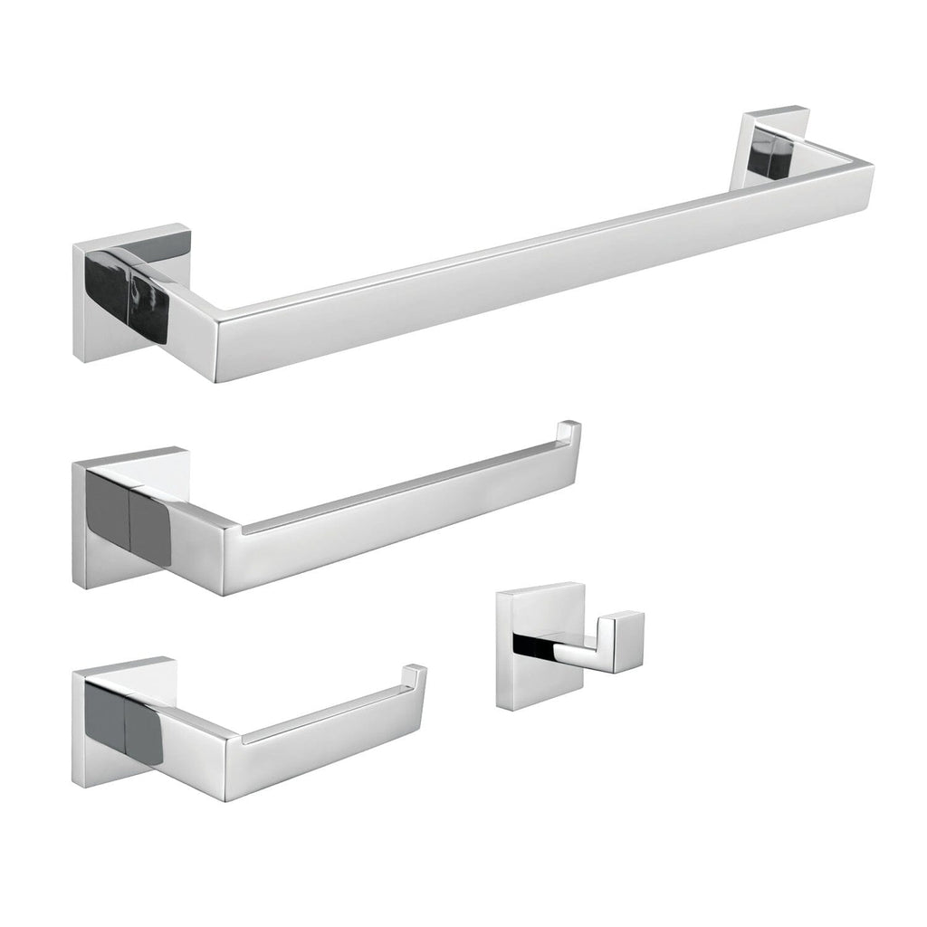 - 4-piece set includes: 18" towel bar, towel holder, robe hook, and toilet paper holder