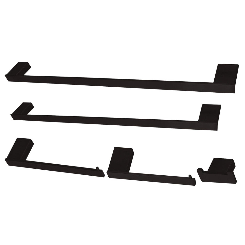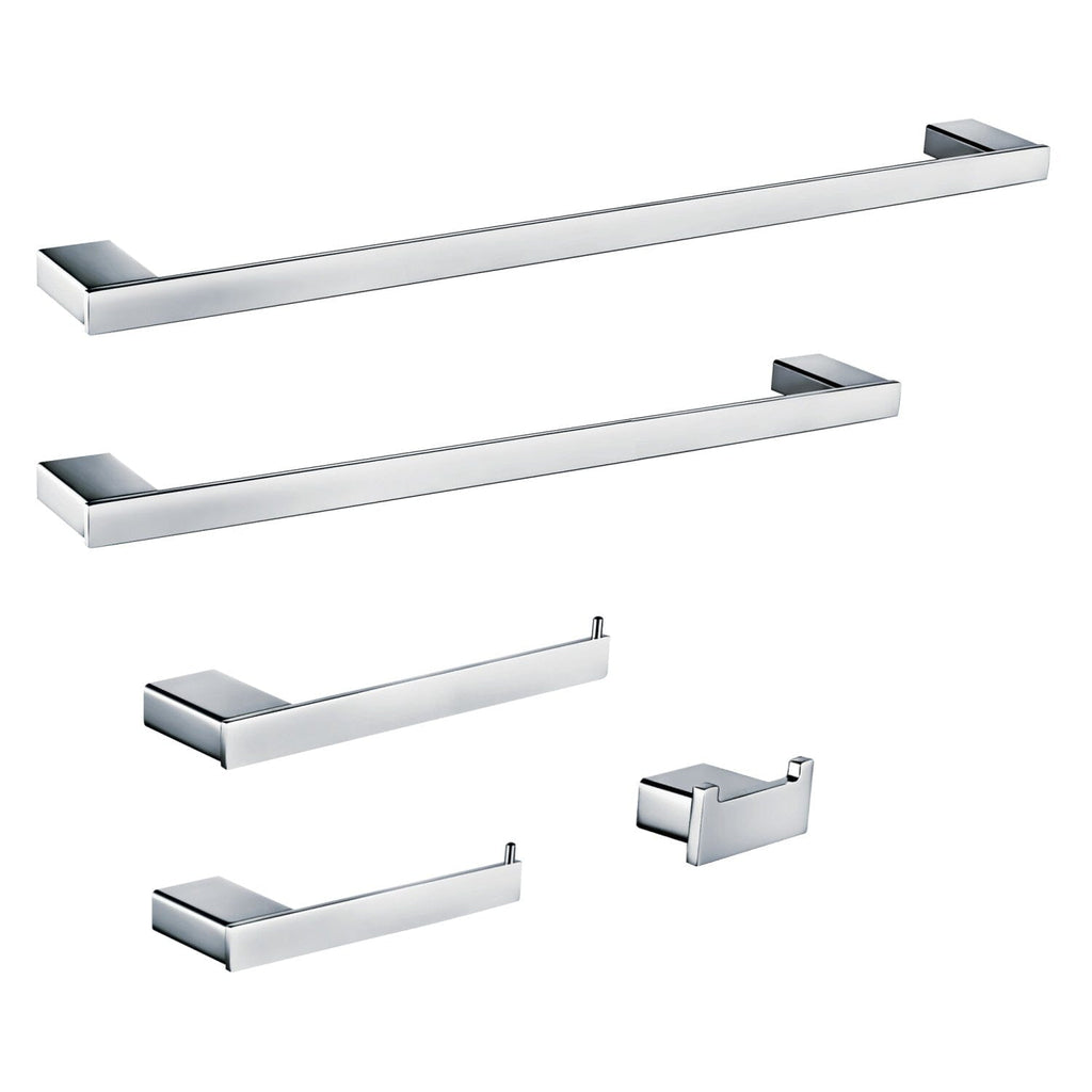 - 5-piece set includes: 18" towel bar, 24" towel bar, towel holder, robe hook, and toilet paper holder