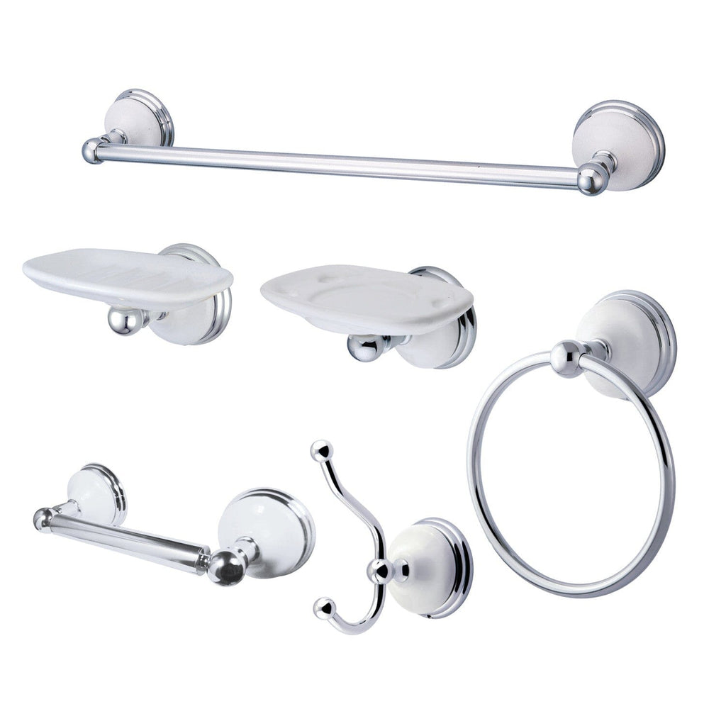 - 6-piece set includes: 24" towel bar, towel ring, soap dish, toothbrush/tumbler holder, robe hook, and toilet paper holder
