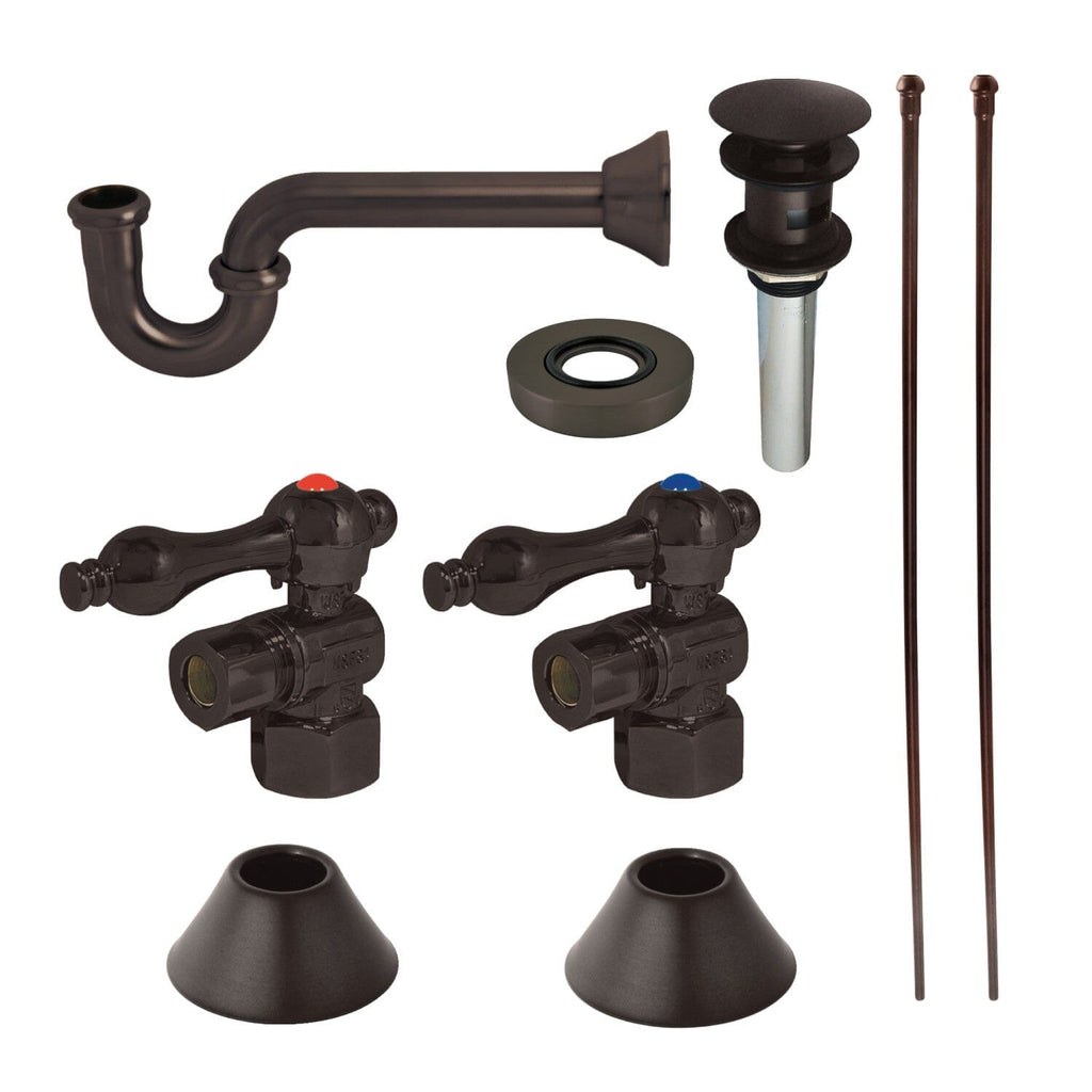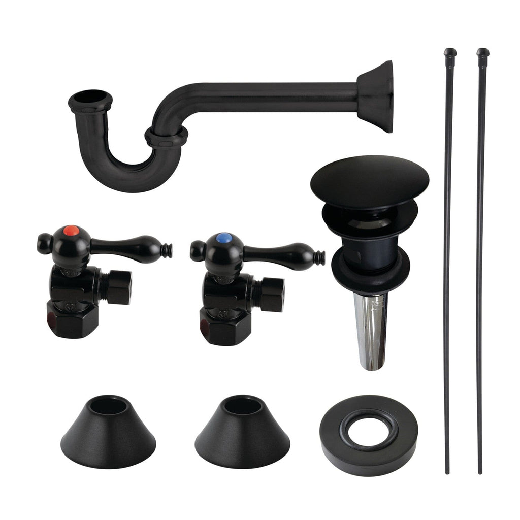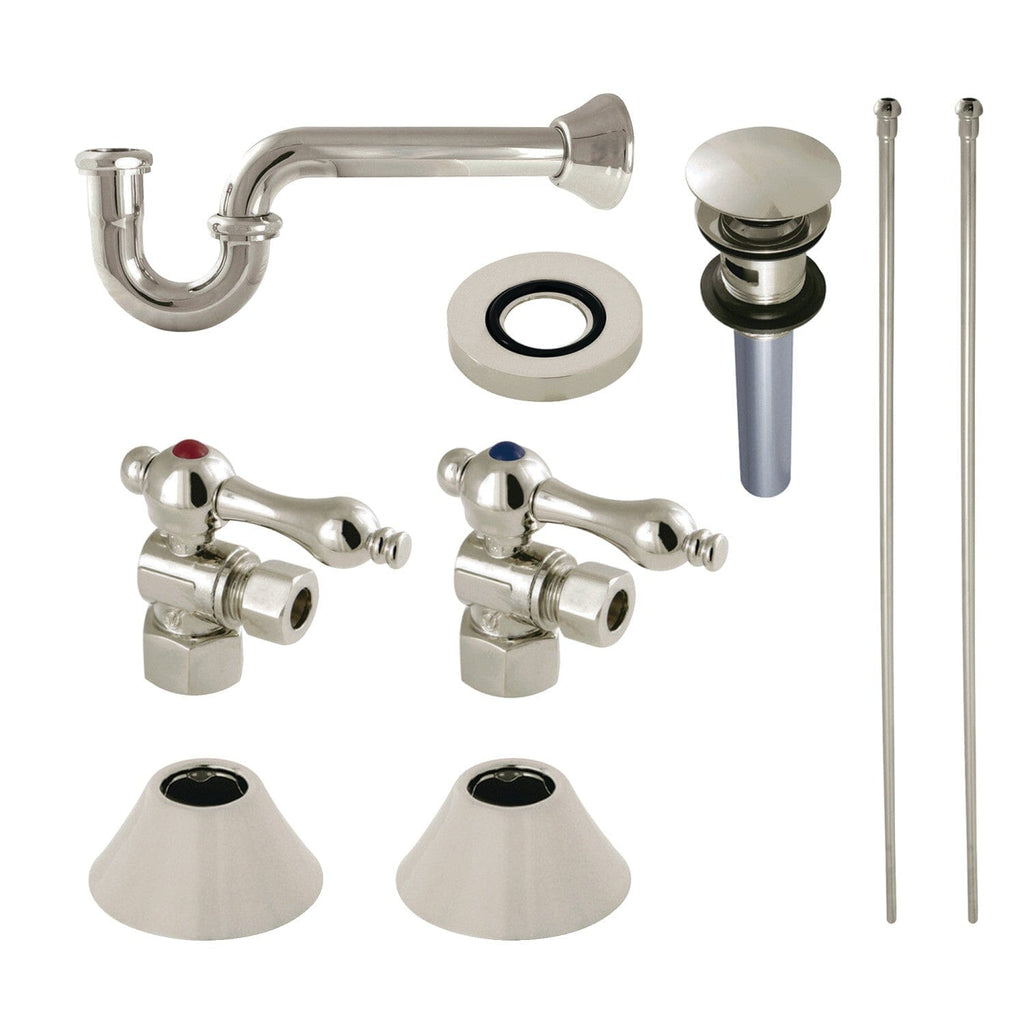 - Kit contains: 2 angle stops, 2 wall flanges, 2 supply lines, 1 p-trap, 1 p-trap wall flange, 1 drain, 1 mounting ring