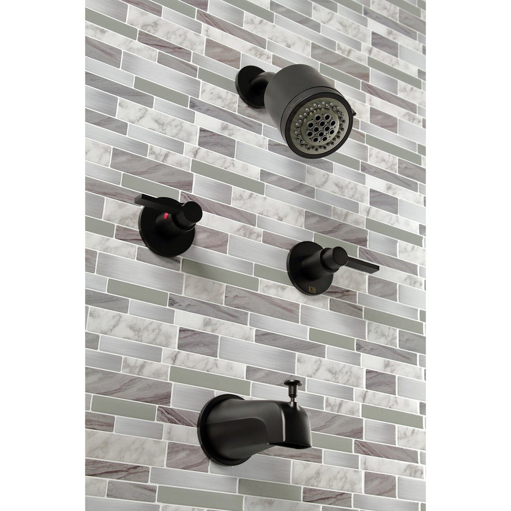 The chic fashion of this tub and shower faucet is distinguished by its expressive geometric features, propelling it into contemporary design. Complete with easy-to-turn lever handles, an optimum bathing experience awaits. Enjoy the sturdy brass construction and premium matte black finish for a fixture that will last for years to come. Internal valve hardware is included for your use.