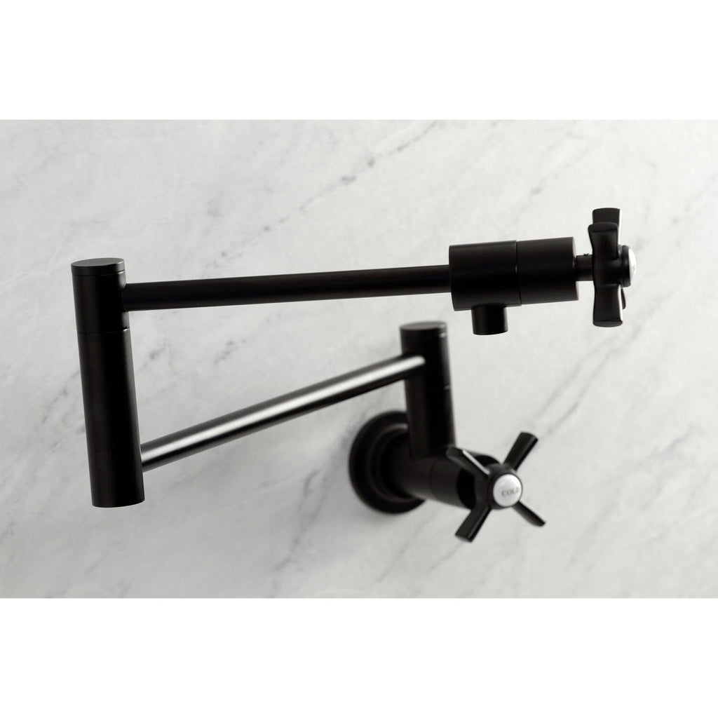 Concord Two-Handle 1-Hole Wall Mount Pot Filler Faucet This faucet boasts bold, sleek design with its cylindrical styling. As an excellent tool to quickly, easily, and stylishly fill pots, eliminate strain on your joints. Pot-fillers are useful gadgets placed directly...
