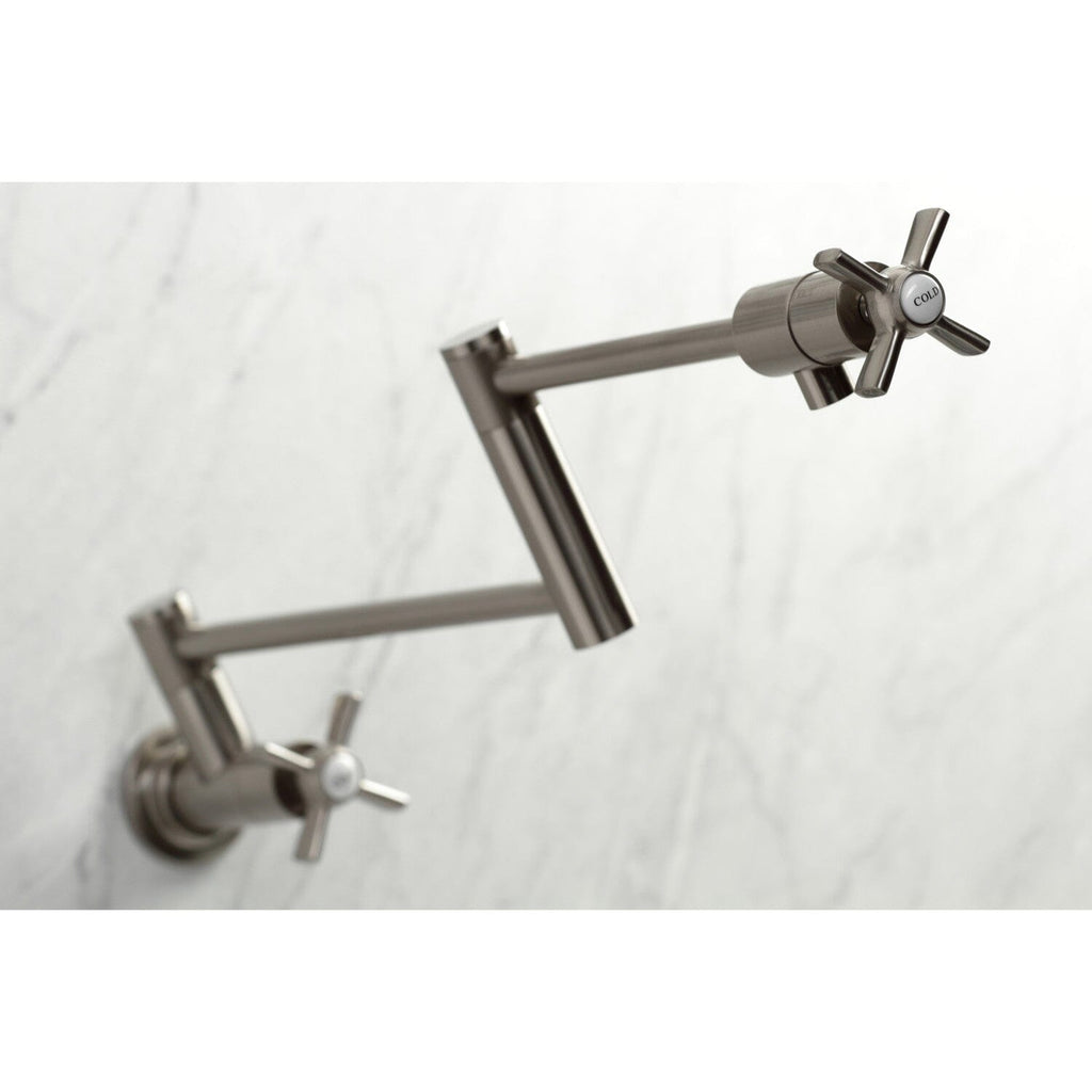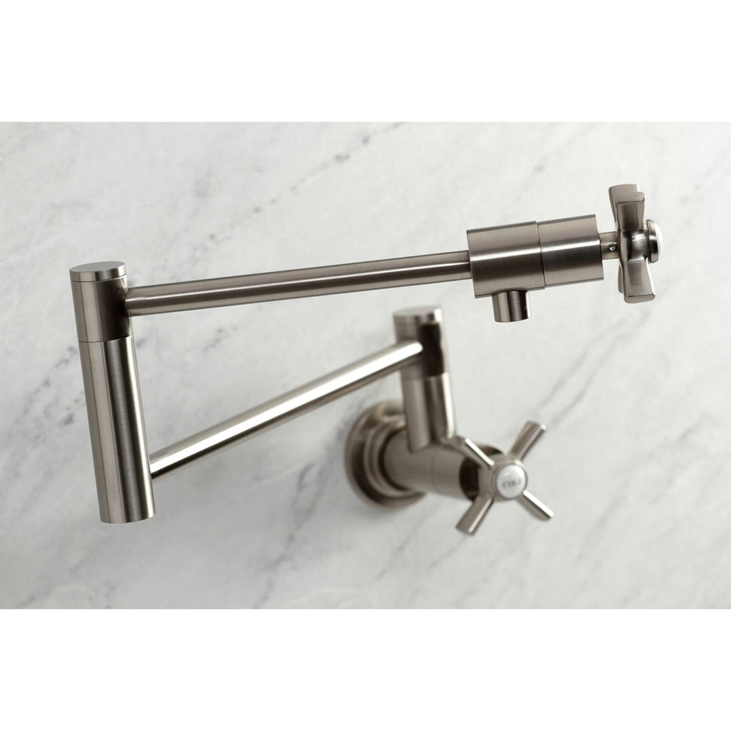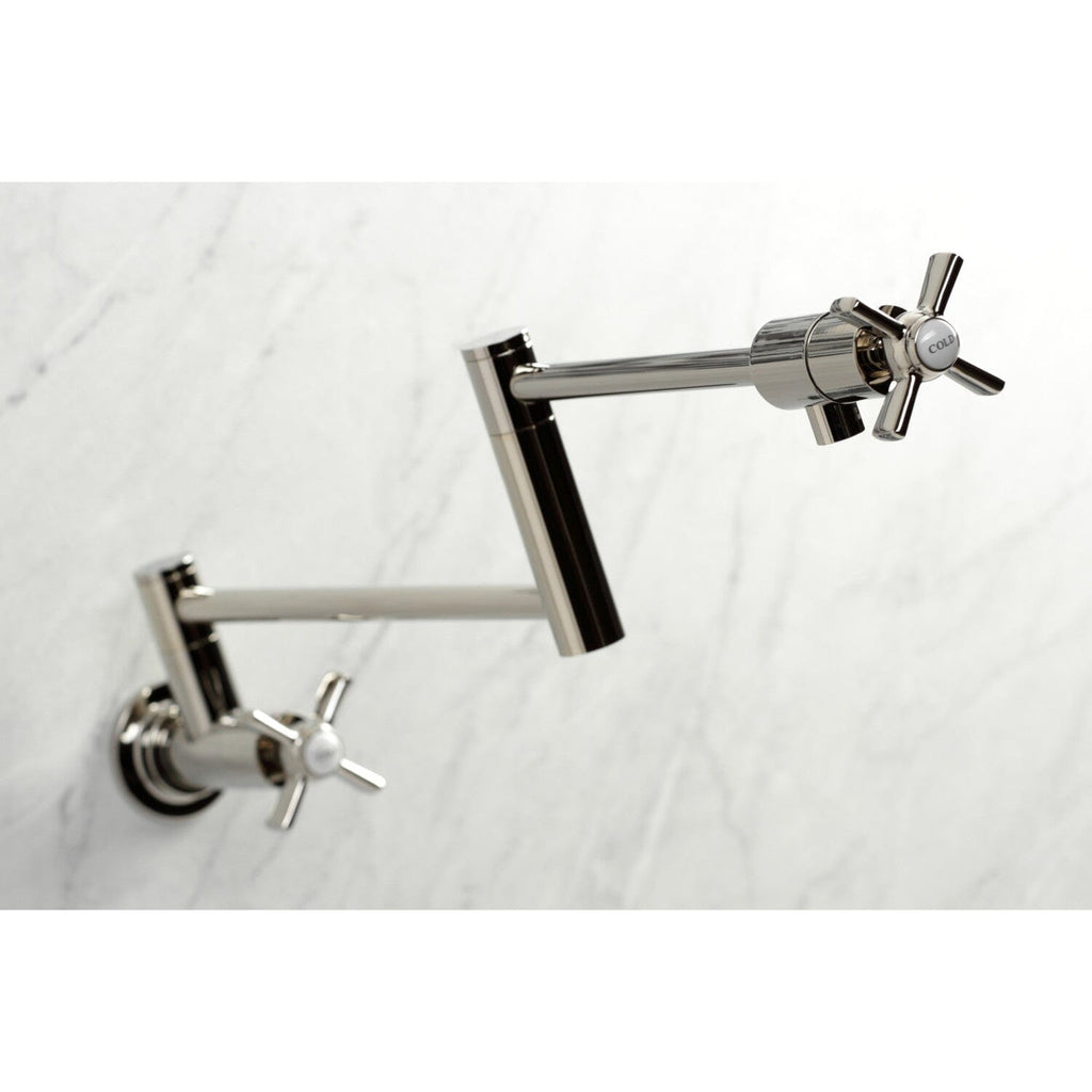 Restoration Two-Handle 1-Hole Wall Mount Pot Filler Faucet Classical artistry from the late 19th Century to early 20th Century is mirrored beautifully within this faucet's traditional charm. As an excellent tool to quickly, easily, and stylishly fill pots, eliminate strain...