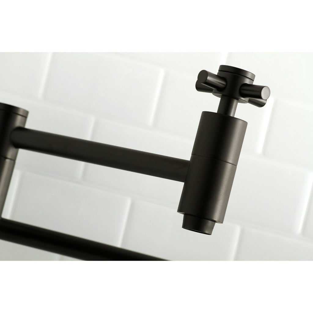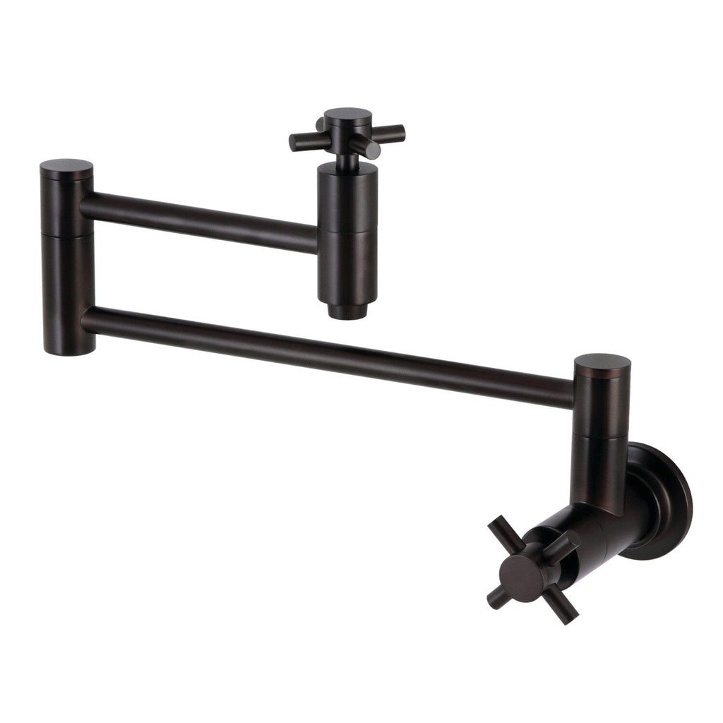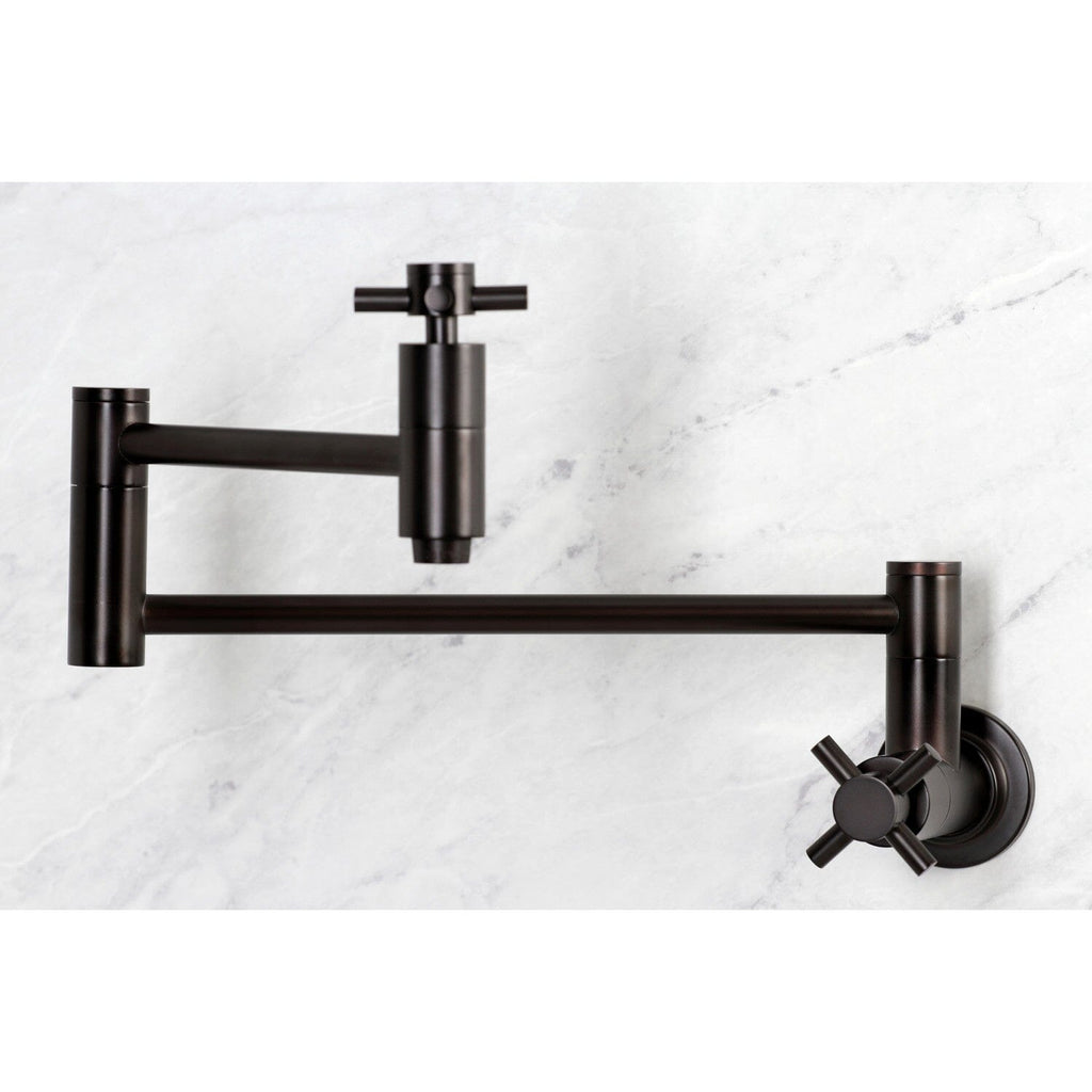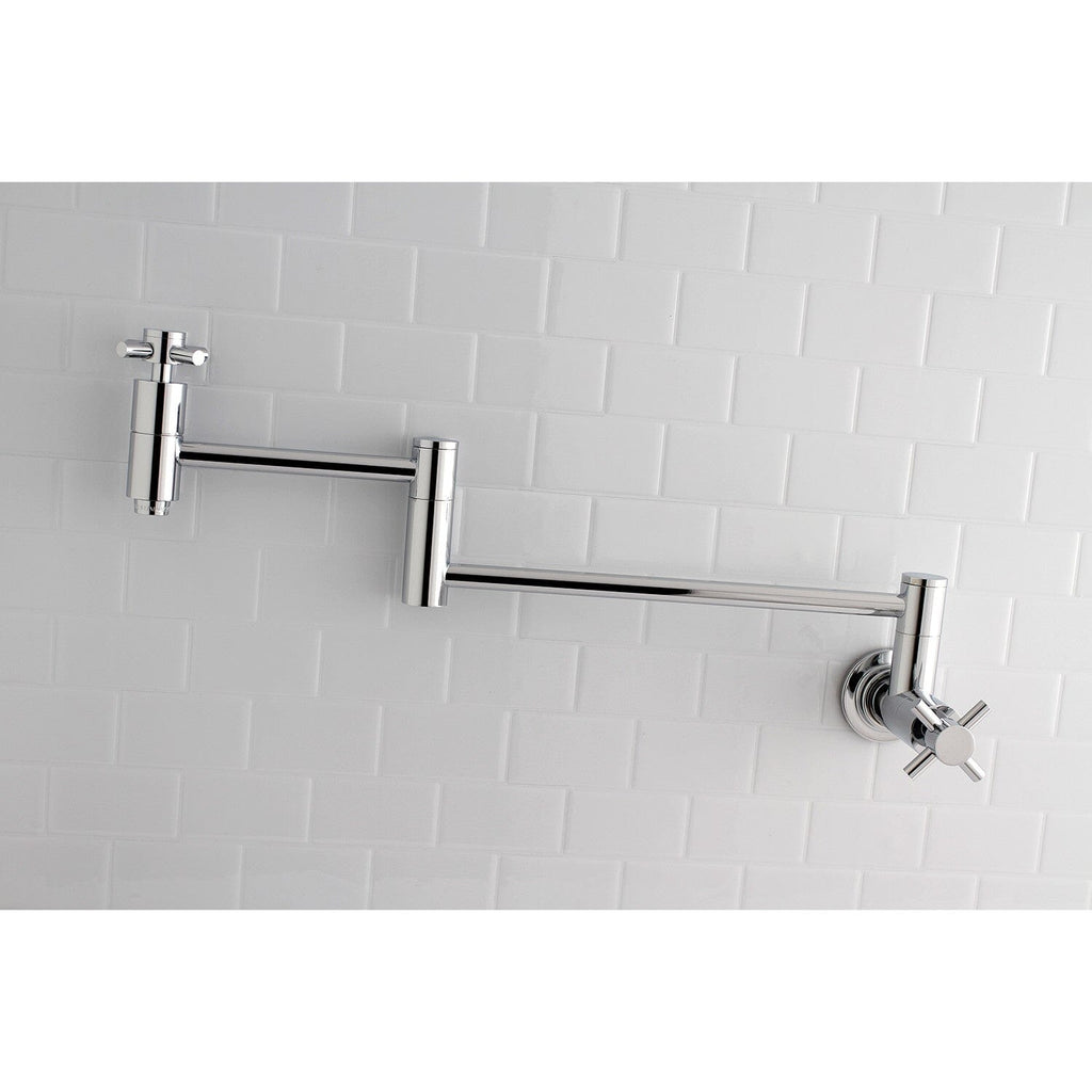 Concord Two-Handle 1-Hole Wall Mount Pot Filler Faucet This faucet boasts bold, sleek design with its cylindrical styling. As an excellent tool to quickly, easily, and stylishly fill pots, eliminate strain on your joints. Pot-fillers are useful gadgets placed directly...
