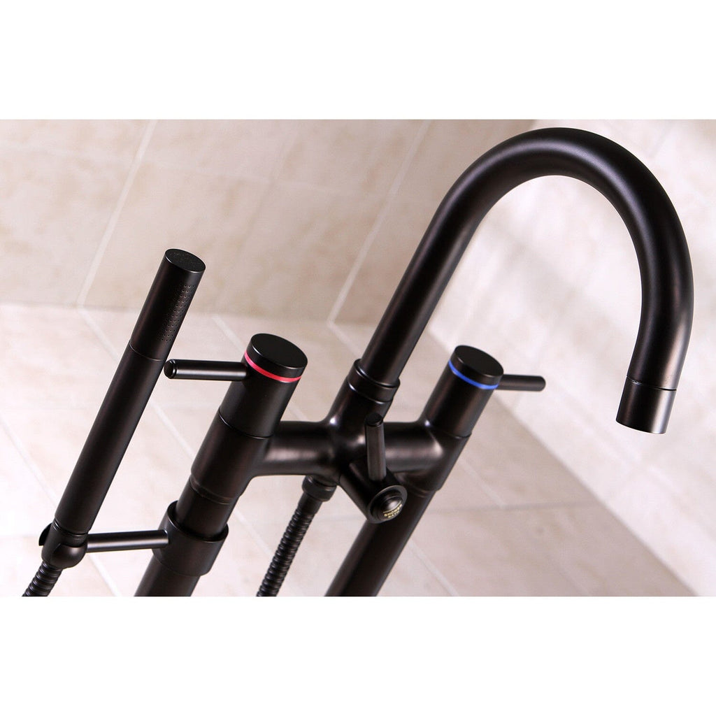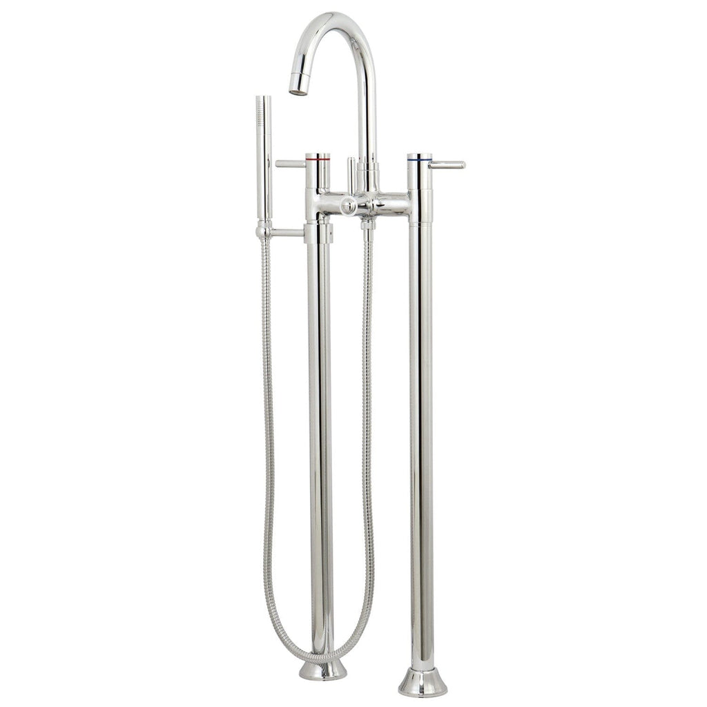 Distinguished for their stately configuration and artsy architecture, freestanding tub faucets are the perfect fixture for any contemporary home to both complement a freestanding tub and act as a beautiful ornamental piece in your bathroom. As the perfect accompaniment to your tub, the Concord Floor Mount Tub Filler with Hand Shower will surely complete your refined bathroom decorum with the help of its premium, glistening oil rubbed bronze finish and hand shower. The solid brass construction also makes for a heavy, quality made product.