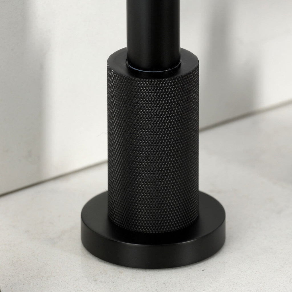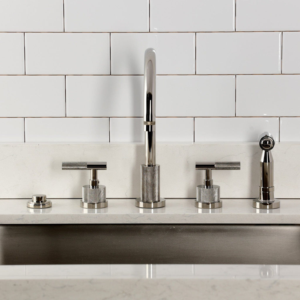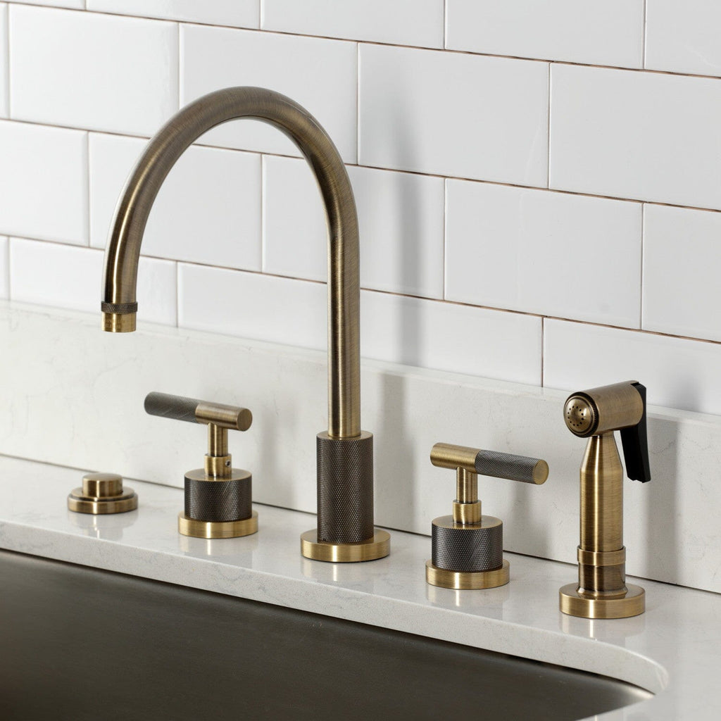 This widespread kitchen faucet with a side spray from the Convergent Collection By Kingston, with its tubular gooseneck spout and knurled lever handle faucet's modern features create a bold and edgy design in your kitchen. Crafted from solid brass and equipped with a durable ceramic cartridge, it ensures years of reliable, trouble-free performance.