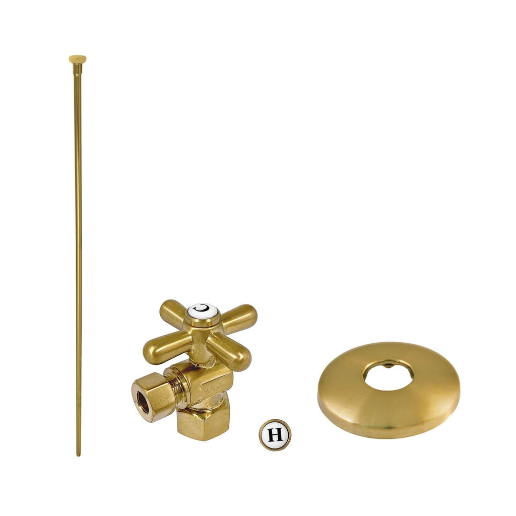 This 3-piece toilet supply kit from Designer Hardware provides all the necessary parts in the water flow process of your bathroom toilet. The set includes a single cross 1/2-14 NPT inlet x 3/8" O.D comp outlet angle stop valve, a 20" flat head supply line, and a traditional flange. Constructed in solid brass for durability and reliability. Available in multiple finishes to easily coordinate with your existing decor.