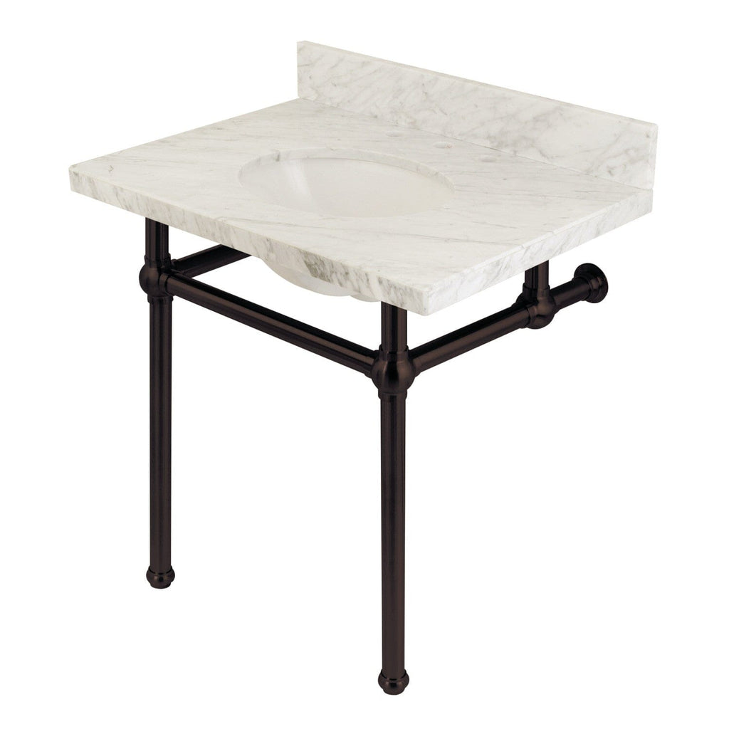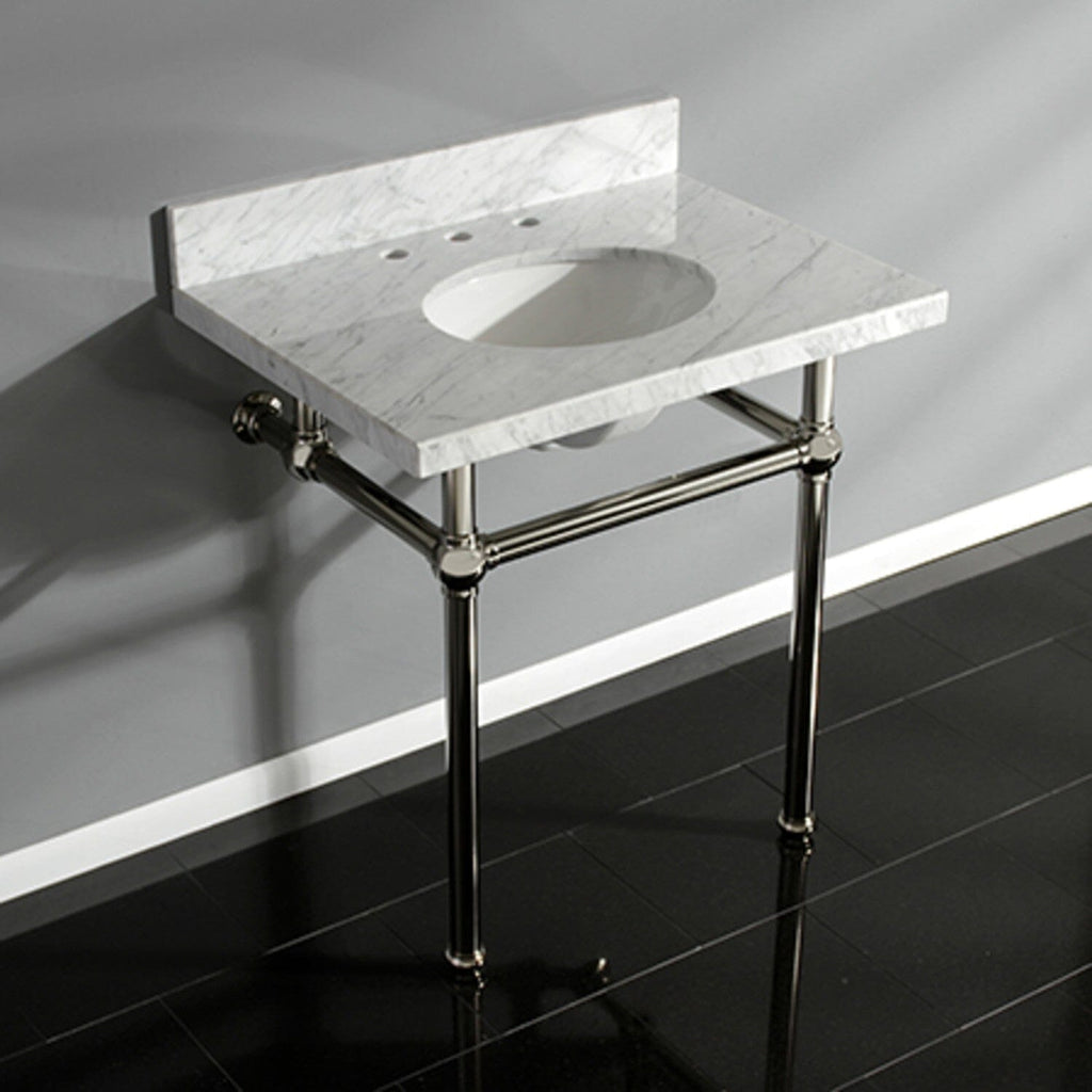 With a beautiful Carrara Marble counter top, this console sink set is a long lasting, durable, and elegant addition to your bathroom. A fabulous alternative where space is limited or tight, making them friendly for the whole family. With different shades and natural designs, otherwise known as veining, no two sinks will be alike. Also for your convenience, anti-slip rubber pads are included with the brass legs to ensure steadiness. Water supply kit, drain assembly, and the faucet are sold separately. Kingston's Carrara Marble tops are polished, but they are not sealed. Polished marble has a shiny surface and resists stains. Natural stone, even when polished, is still somewhat porous and does remain susceptible to etching by acidic compounds like fruit juice, vinegar, some cleaning solvents, etc. For customers that wish to further protect their investment the marble can be sealed. The following is intended solely for informational purposes. Kingston does not warranty nor accept liability for damages or other negative outcomes resulting from any treatment or coating applied to the countertop after purchase, whether applied by the customer or by a third party. For anyone unfamiliar with this nature of project, Kingston recommends consulting an experienced professional in your area. When looking for a sealant product, please be sure to seek a product specifically designed for use on polished marble, granite or other natural stone surfaces. Be sure to always avoid anything containing a citrus ingredient, acid ingredient, tung oil, linseed oil, or other natural oils. These can damage or discolor your marble.