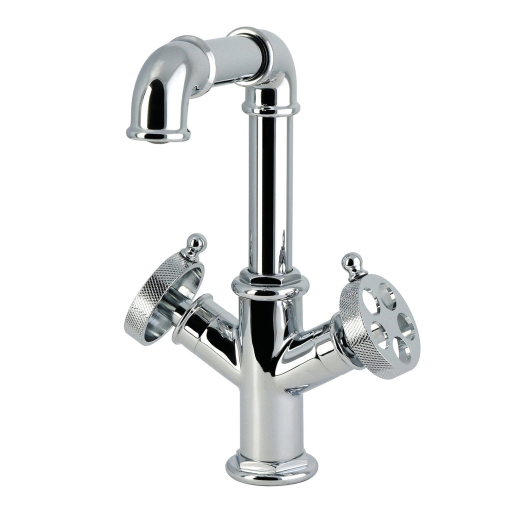 Introducing the industrial-style single-hole bathroom faucet from the Wendell Collection® by Designer Hardware. This striking faucet features a tubular hi-rise spout with exposed elbows and unique wheel handles, adding a whimsical industrial touch that transforms any bathroom into a focal point. The single-hole design allows for easy installation, while the textured wheel handles ensure effortless operation. This faucet also includes a convenient push-up drain for added functionality. Crafted from solid brass and equipped with durable ceramic disk cartridges, this faucet promises years of reliable performance. Enhance your bathroom aesthetic with this captivating blend of style and practicality.
