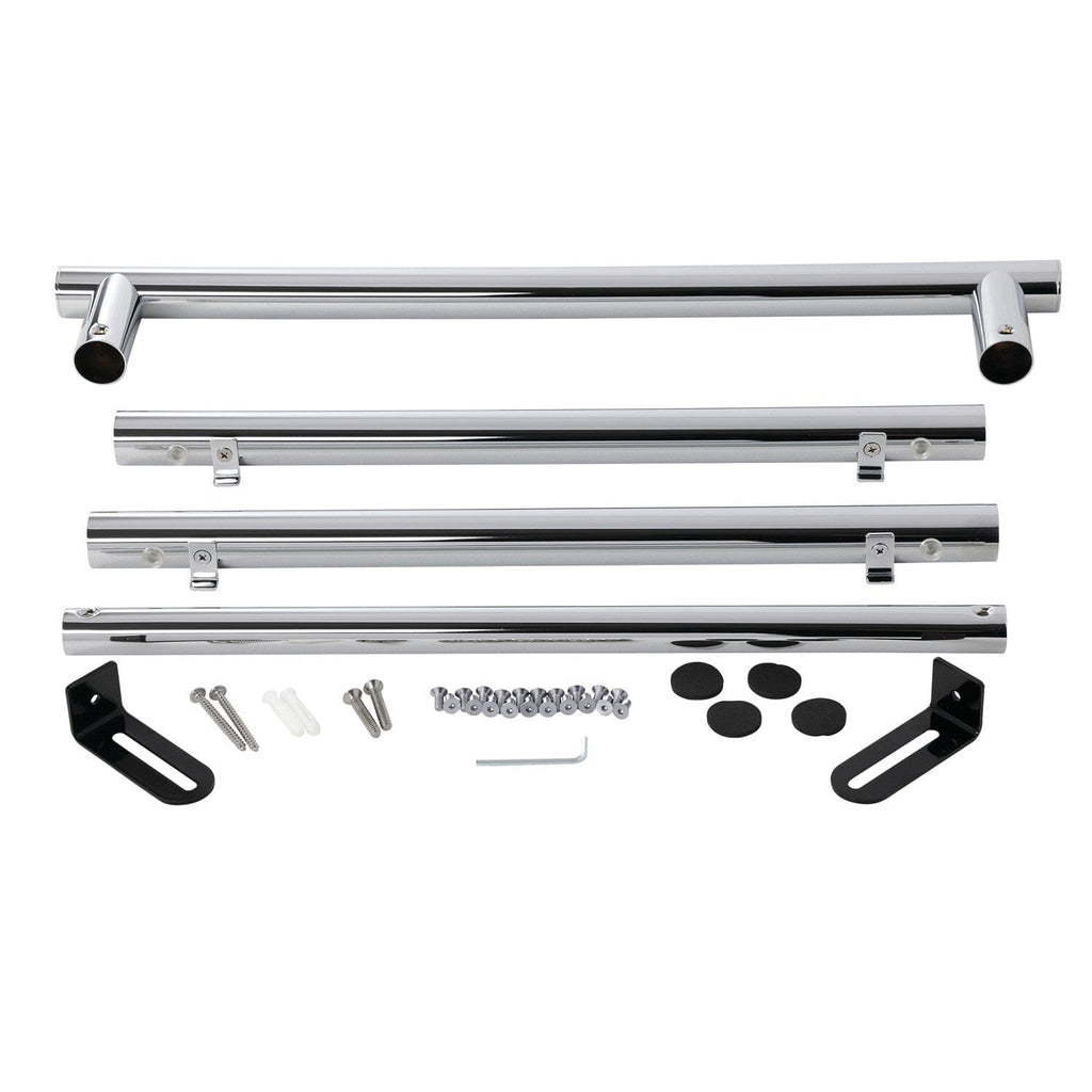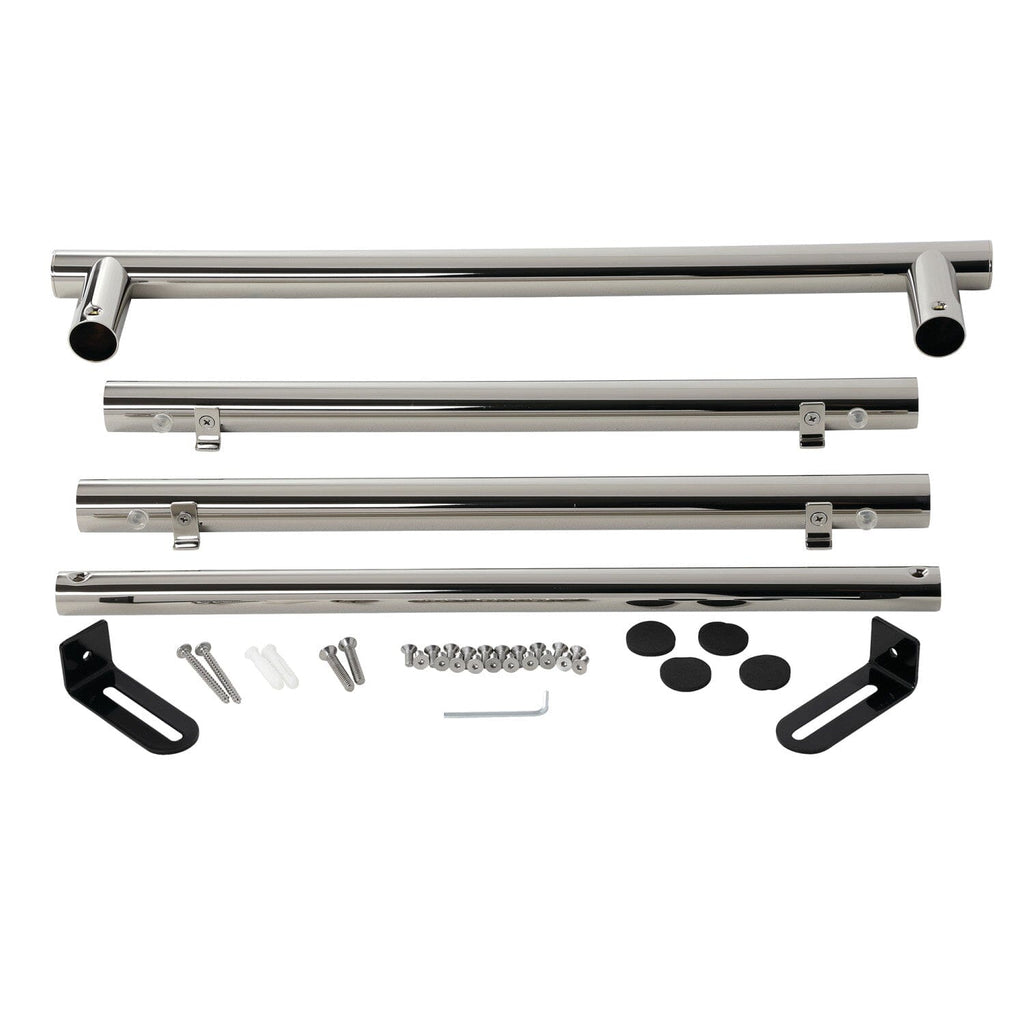 A simple minimalist support for your console sink legs, this leg front and wall support comes in a multitude of finishes that will bring out the shine in your bathroom. The Sheridan console sink leg front and wall support is constructed out of stainless steel and is designed for durability and reliability to last for years to come. Pair these leg wall support with Designer Hardware console sink leg support to complete a console sink base, check model for compatibility. Includes a 24" front towel bar for your convenience.
