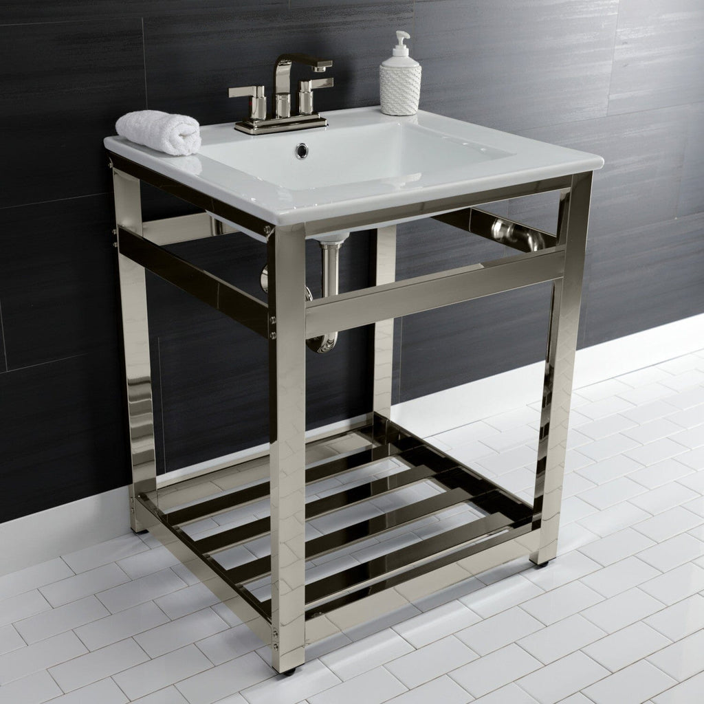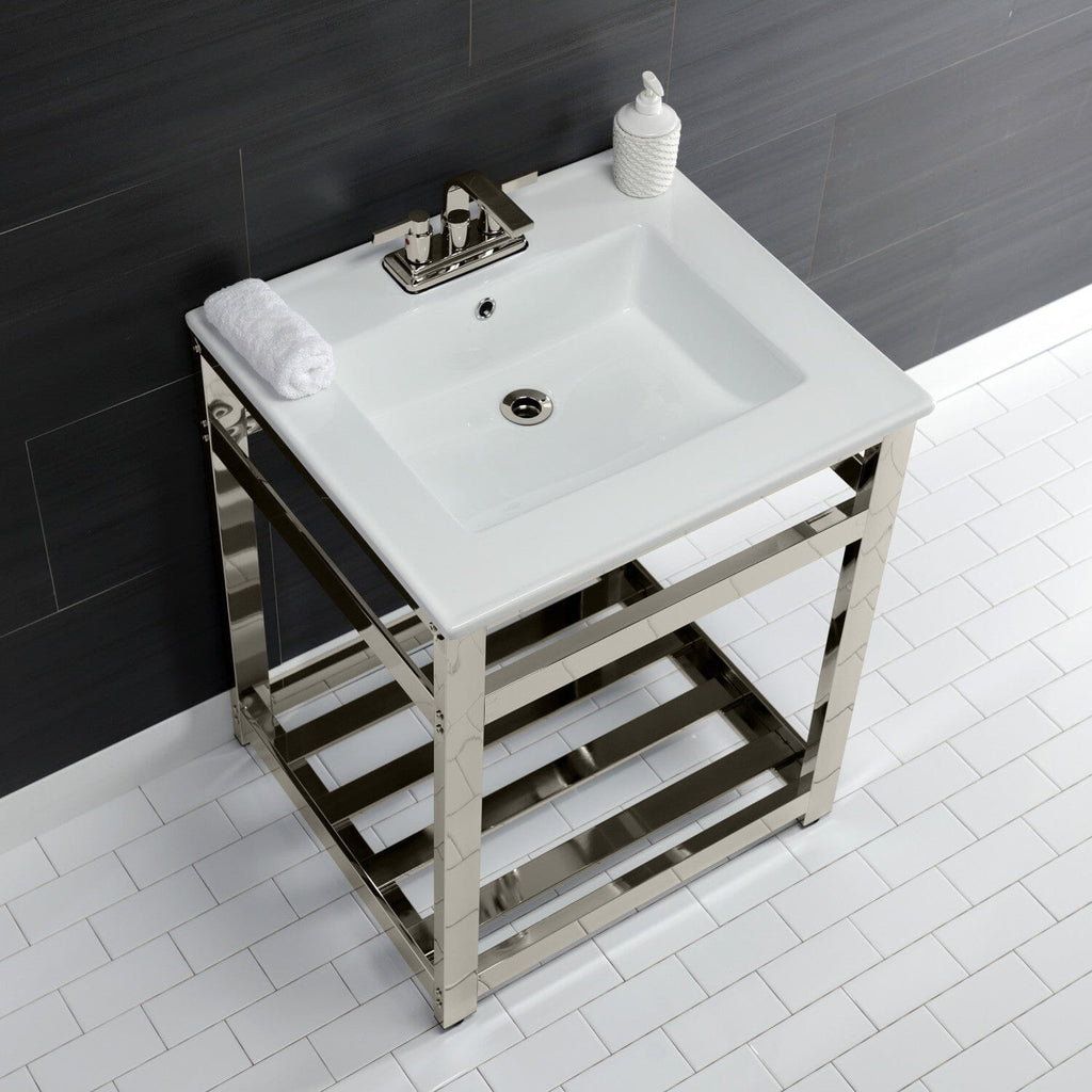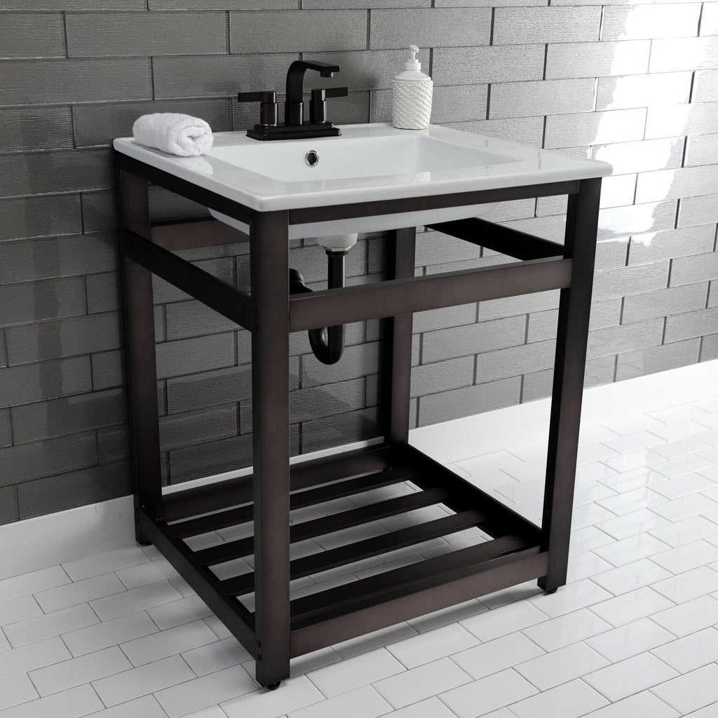 Quadras 25-Inch Ceramic Console Sink with Steel Base and Shelf (4-Inch, 3-Hole)