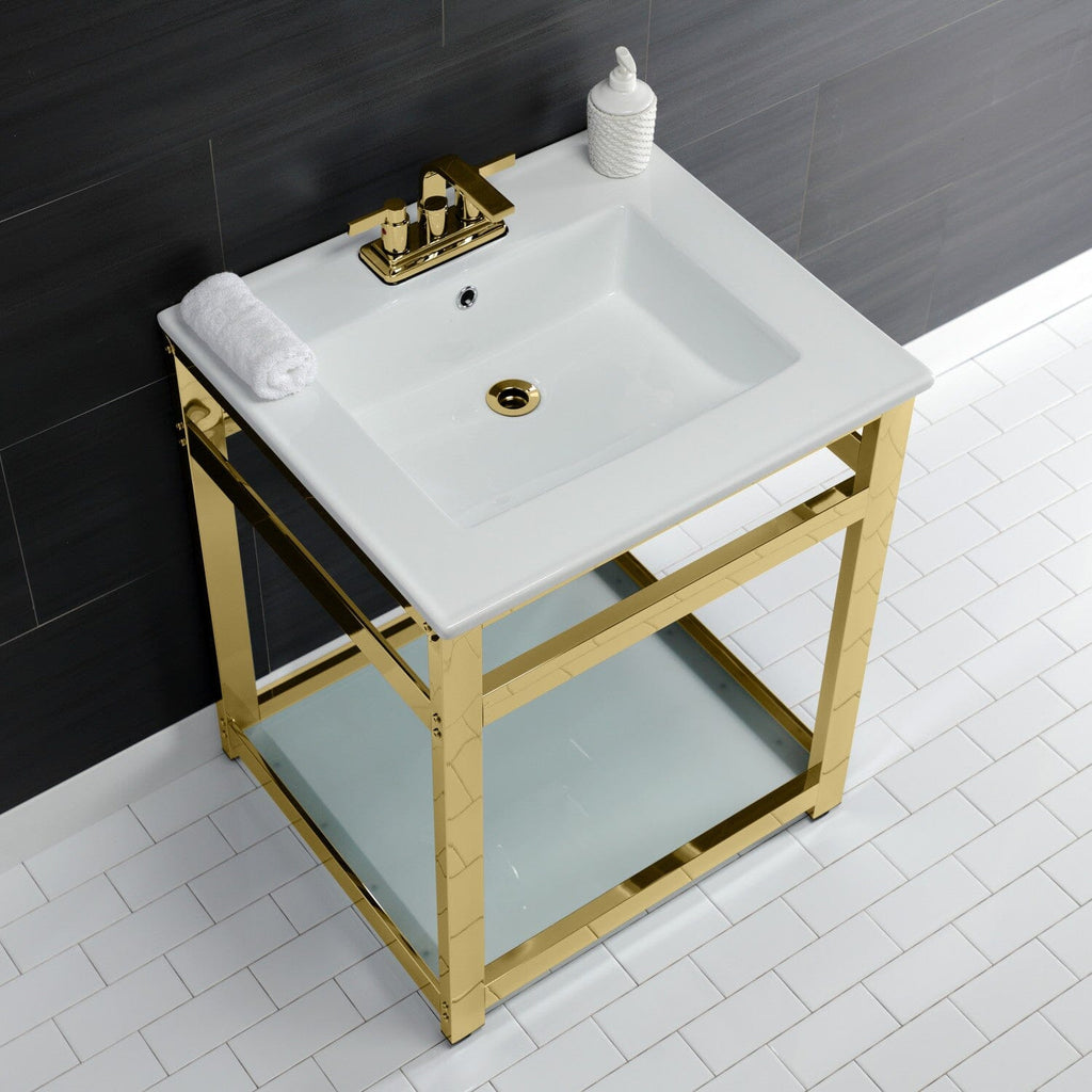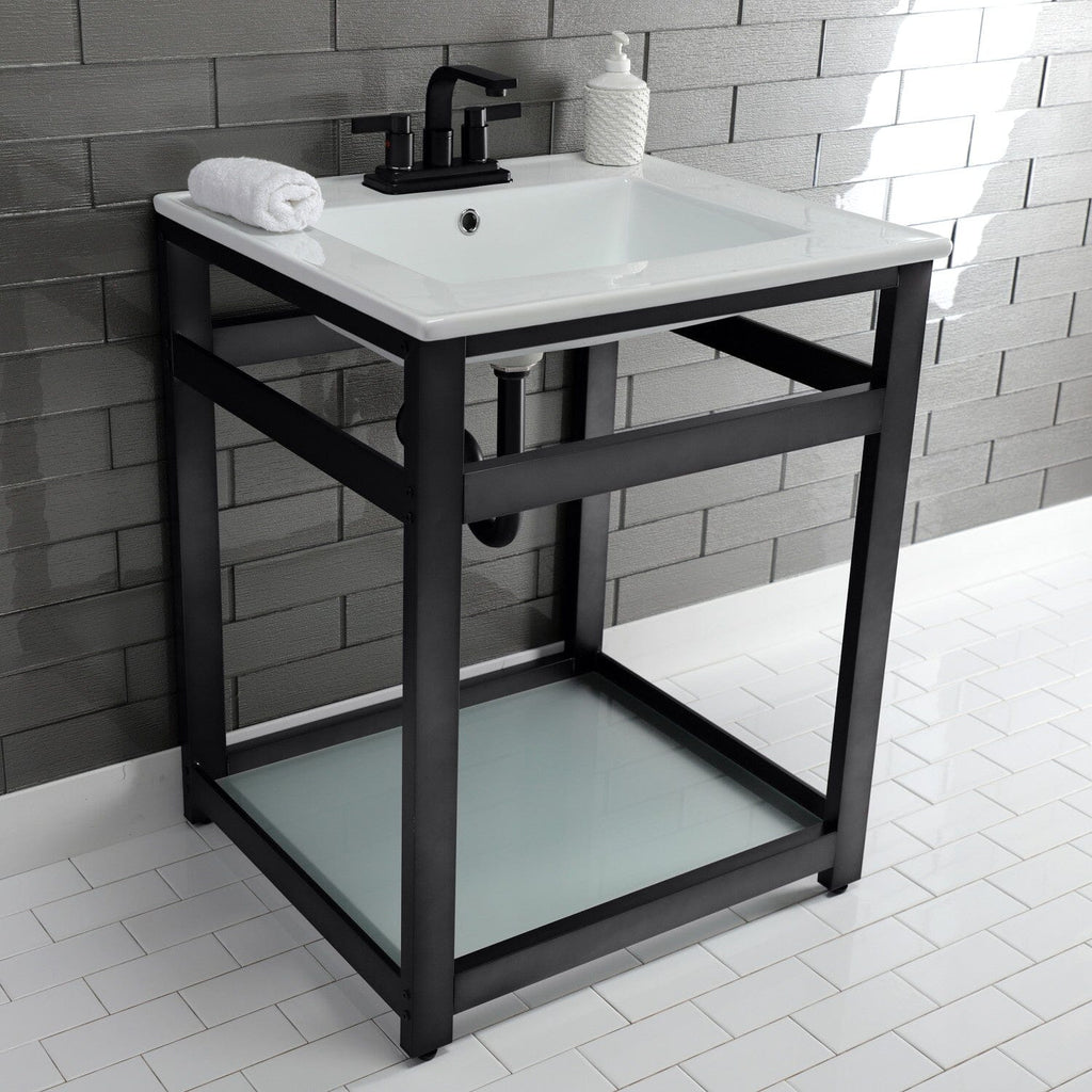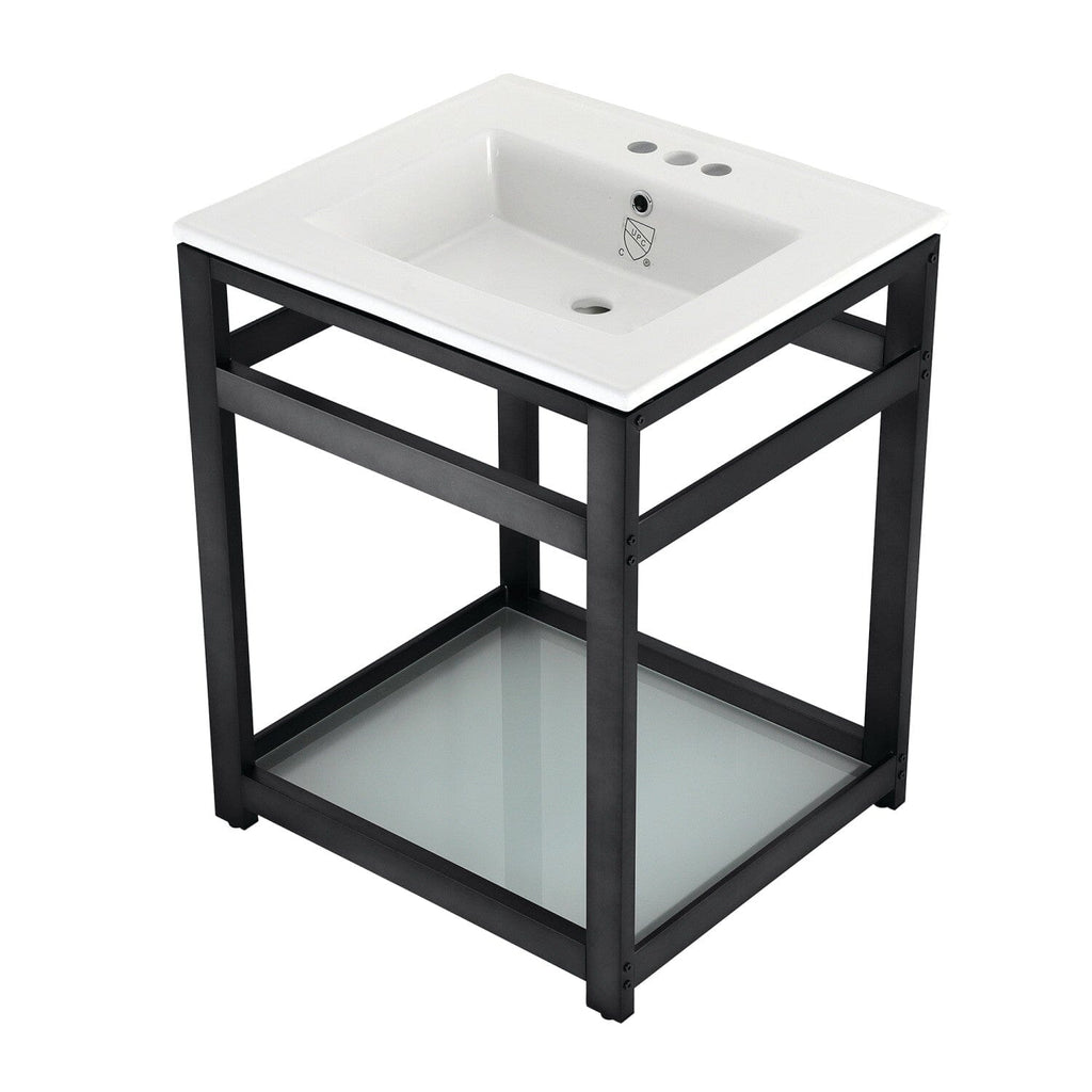 Quadras 25-Inch Ceramic Console Sink with Steel Base and Glass Shelf (4-Inch, 3-Hole)