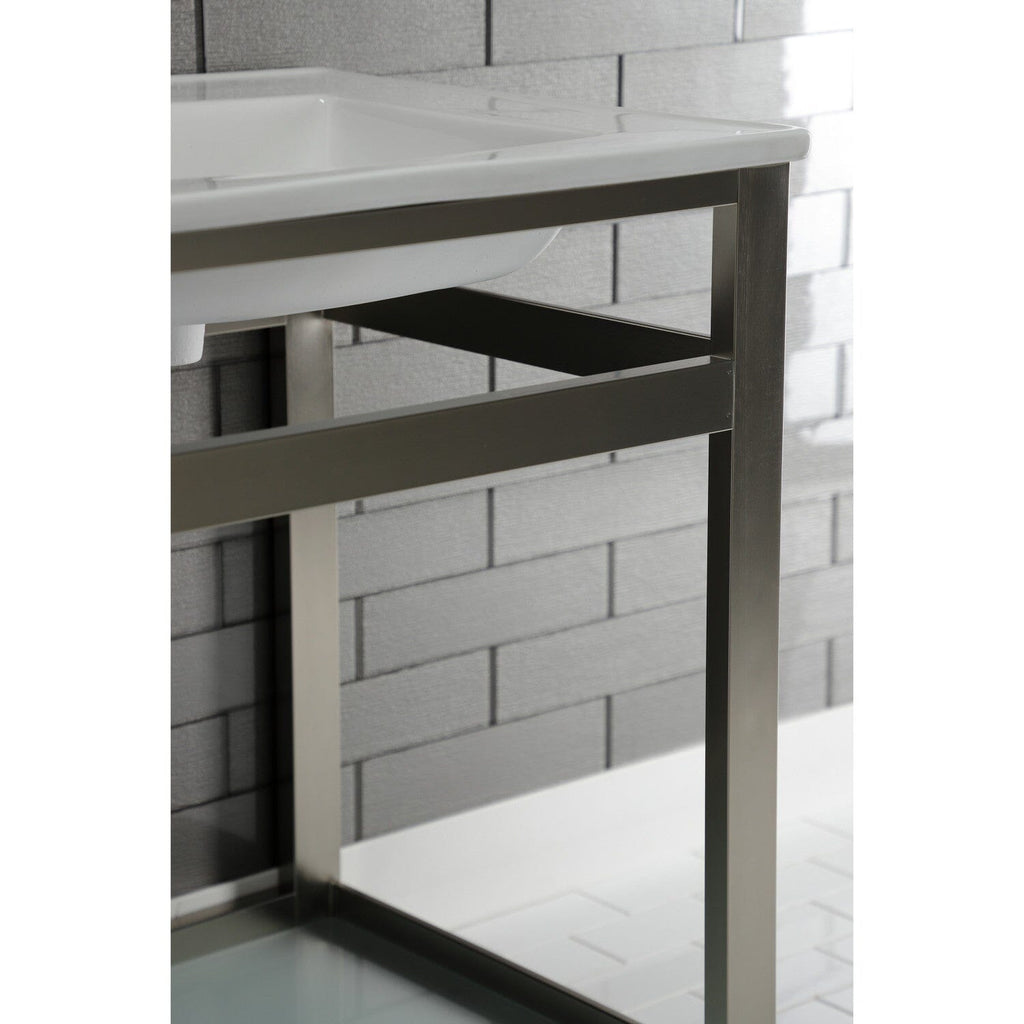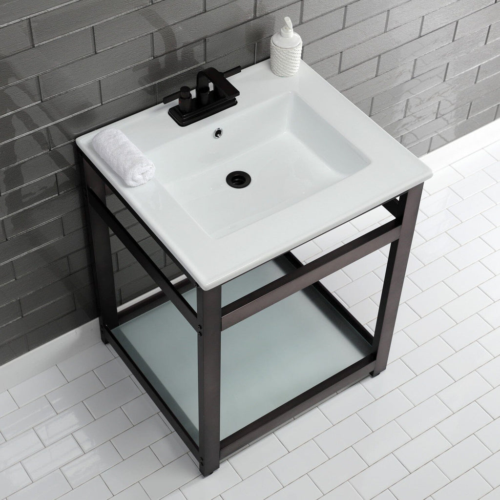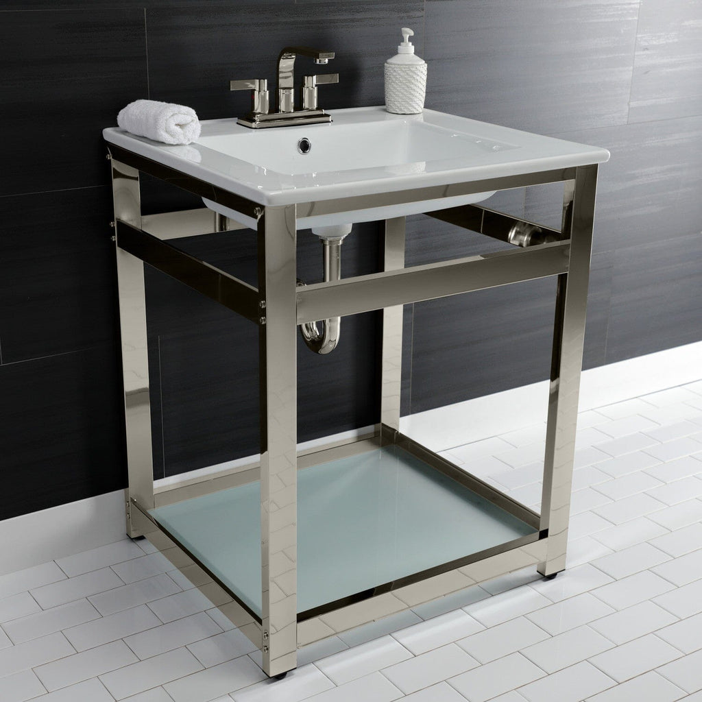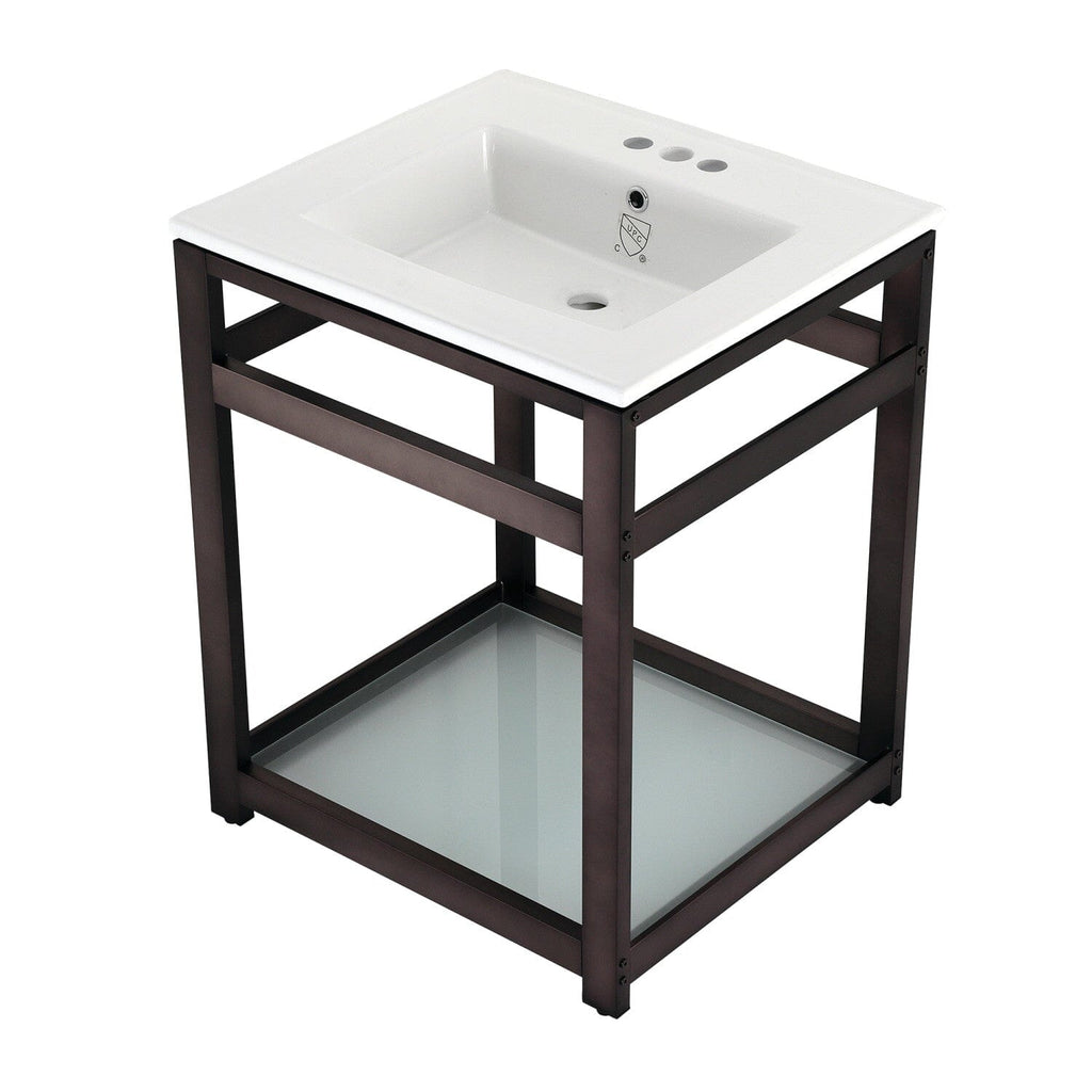 Quadras 25-Inch Ceramic Console Sink with Steel Base and Glass Shelf (4-Inch, 3-Hole)