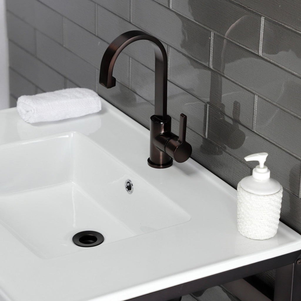 Exquisitely styled for your contemporary taste, this console sink will enhance your bathroom living space. With a beautiful ceramic counter top, this console sink set is a long lasting, durable, and elegant addition to your bathroom. The Designer Hardware 31-inch ceramic console sink (1-hole) features a wash basin and steel base that is available in a handful of finish options. Solid ceramic sinks and tops like the LBT-series top in this listing are finished with a glossy glaze on the top and sink basin interior, making for a pristine, stain-resistant surface and glistening finish that is easily maintained. The underside and basin exterior are unglazed/unfinished and coated with a matte white protective sealant that prevents moisture absorption and staining. Solid ceramic pieces cannot be glazed on all sides, because the nature of ceramic material requires a minimum surface area be left raw during the glaze firing process so the piece does not explode. Water supply kit, drain assembly, and the faucet are sold separately.