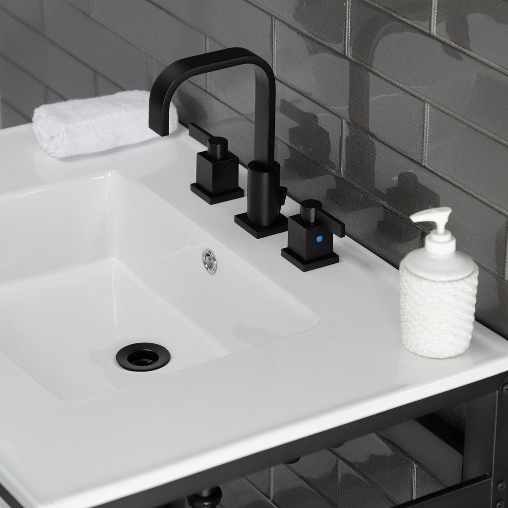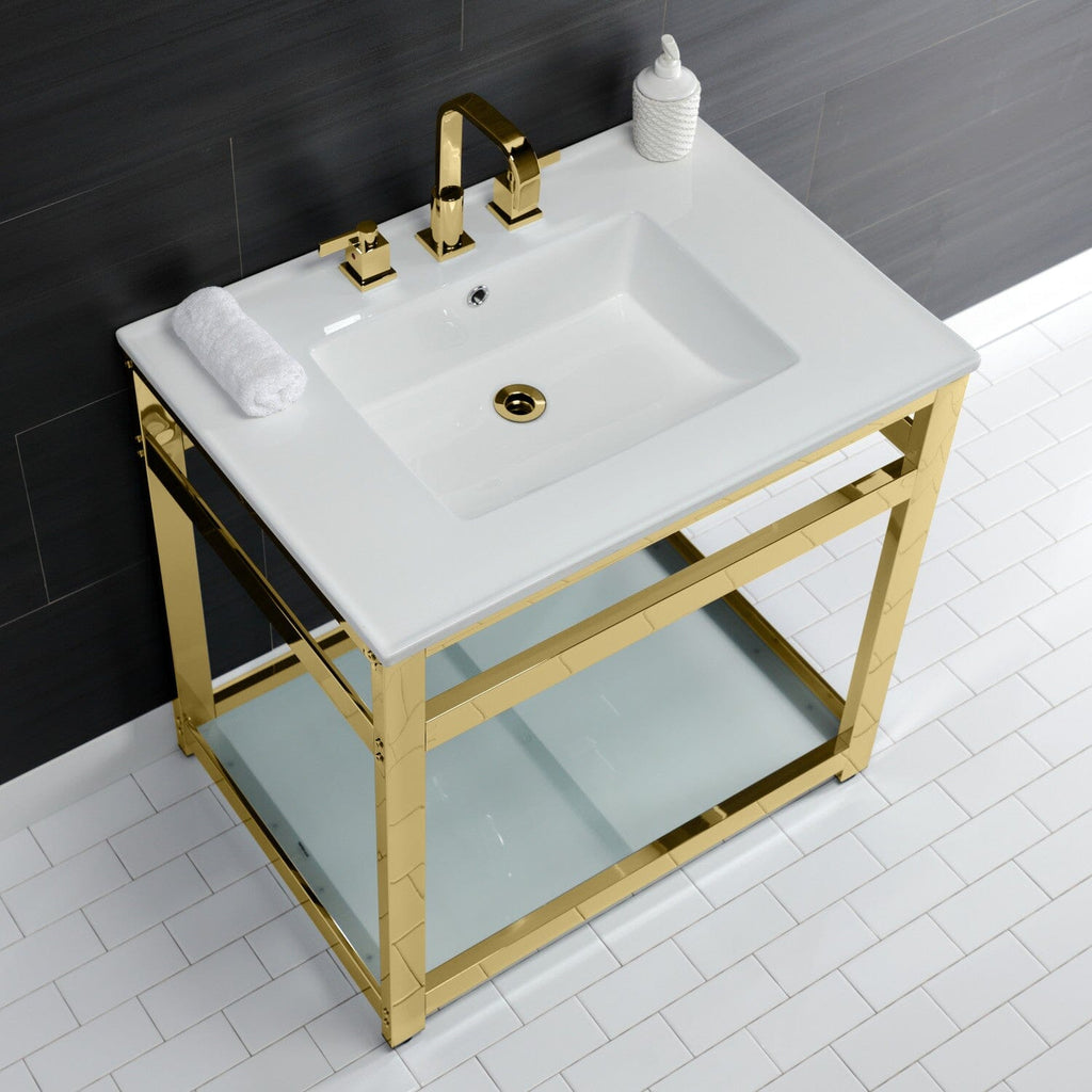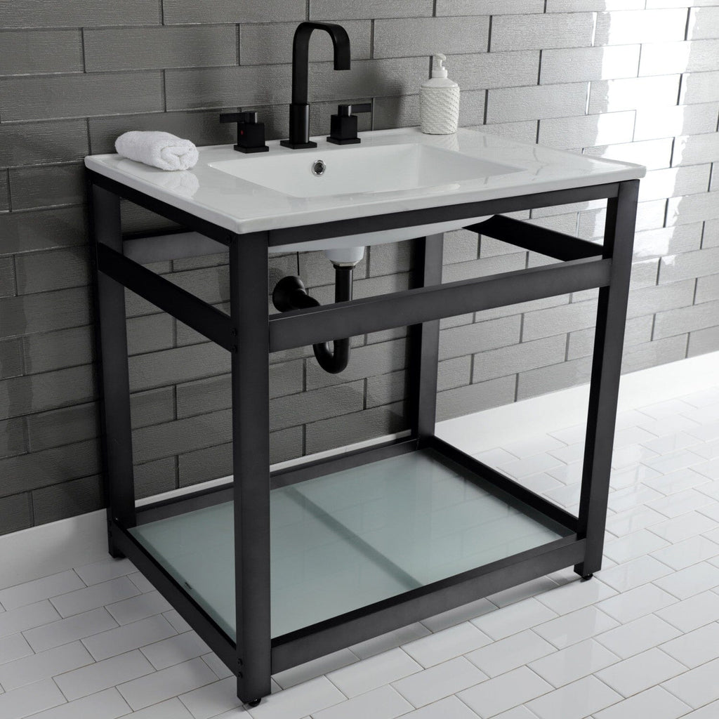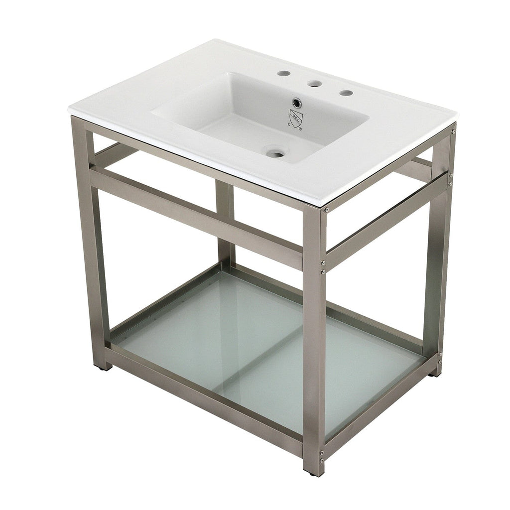 Quadras 31-Inch Ceramic Console Sink with Steel Base and Glass Shelf (8-Inch, 3-Hole)